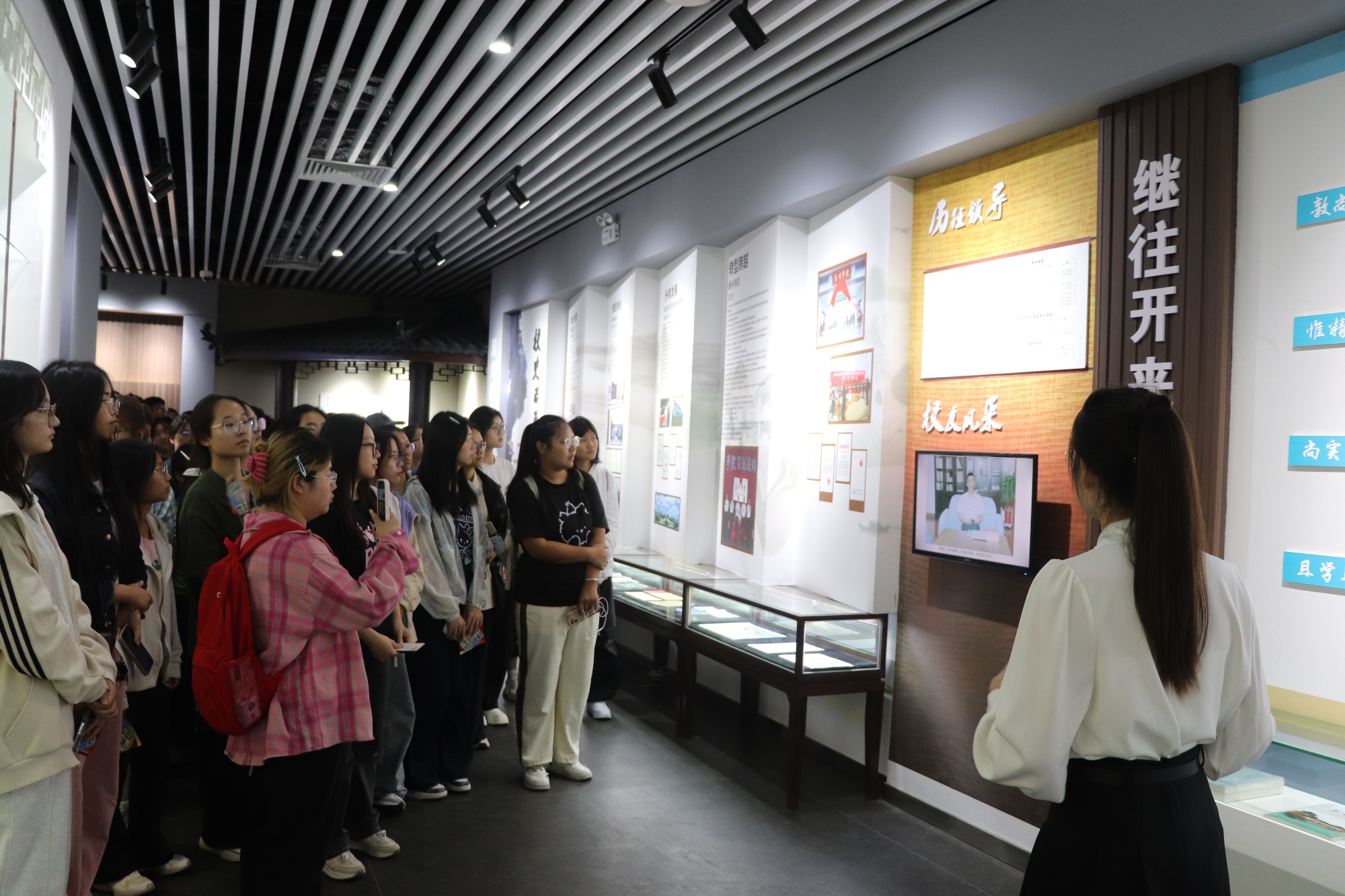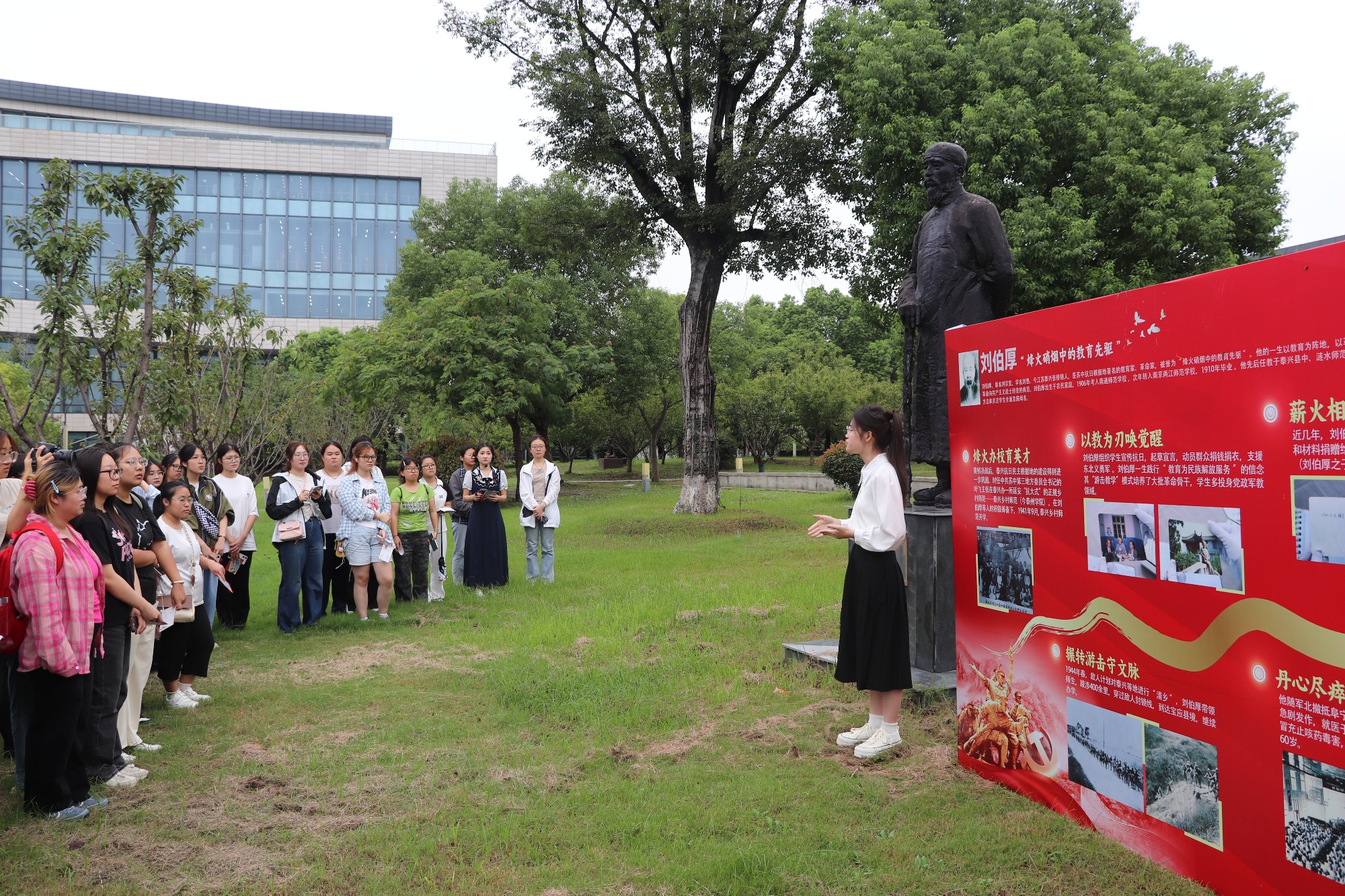 在学校发展馆,师生怀着崇敬之心了解学校从创办初期的筚路蓝缕,到如今在教育领域的深耕壮大,深切感受到学校的深厚底蕴与优良传统。他们在首任校长刘伯厚烈士雕像前聆听英雄事迹,感受抗战岁月中刘伯厚坚持办学、以教育为武器投身革命事业的奋斗精神。