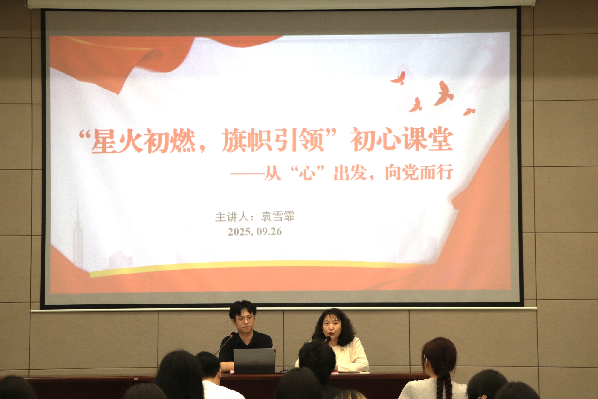 图书馆胡瑗讲堂内,学工党支部书记袁雪霏以“从心出发,向党而行”为题上党课。她从“新起点、新时代、新使命”三大板块展开,深入诠释“扎根、深耕、勇闯、善创”的泰院精神,鼓励师生用实际行动践行新时代青年的责任与担当。