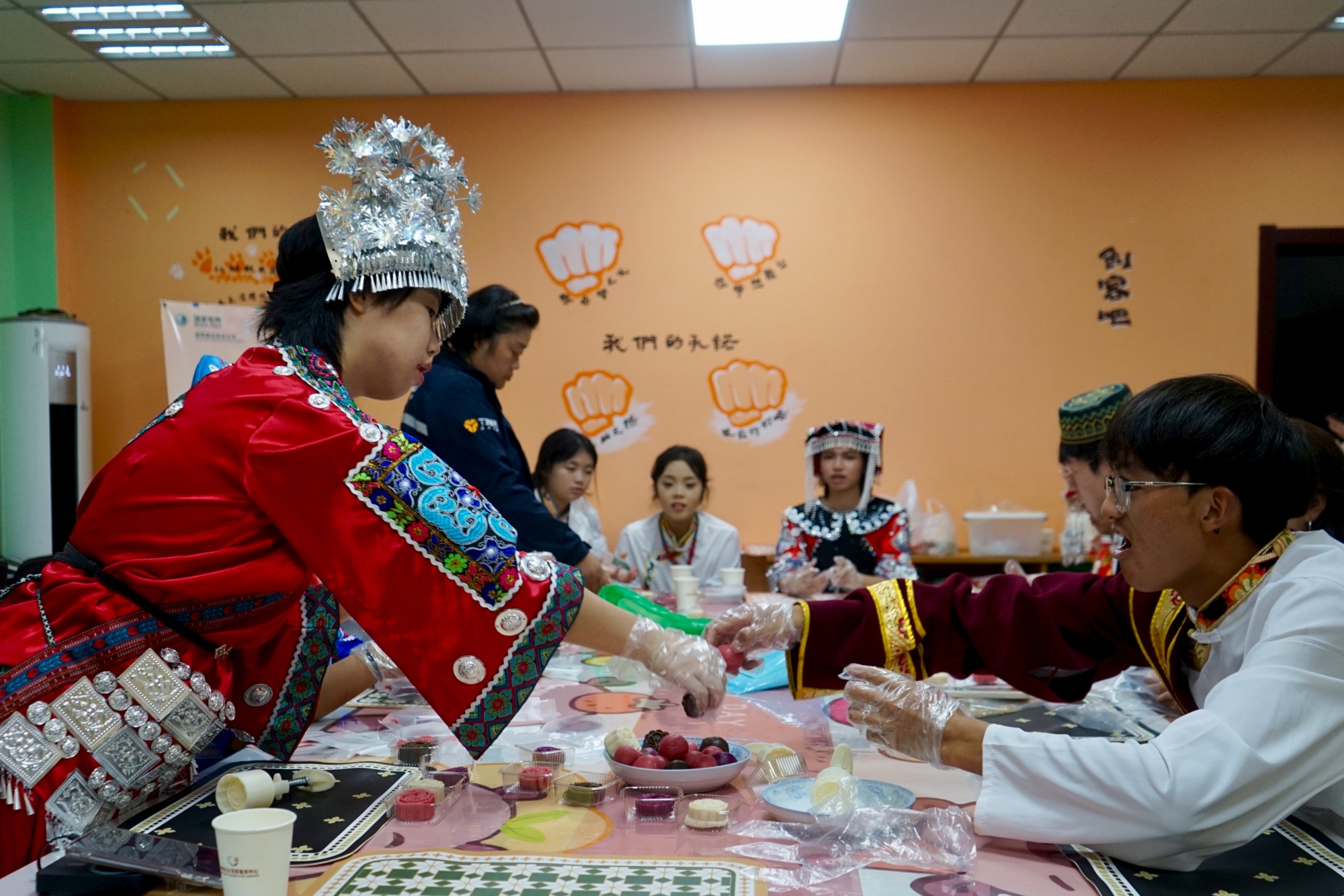 演出结束后,人文学院的学生代表与社会各界新就业群体共同做月饼,唠家常。