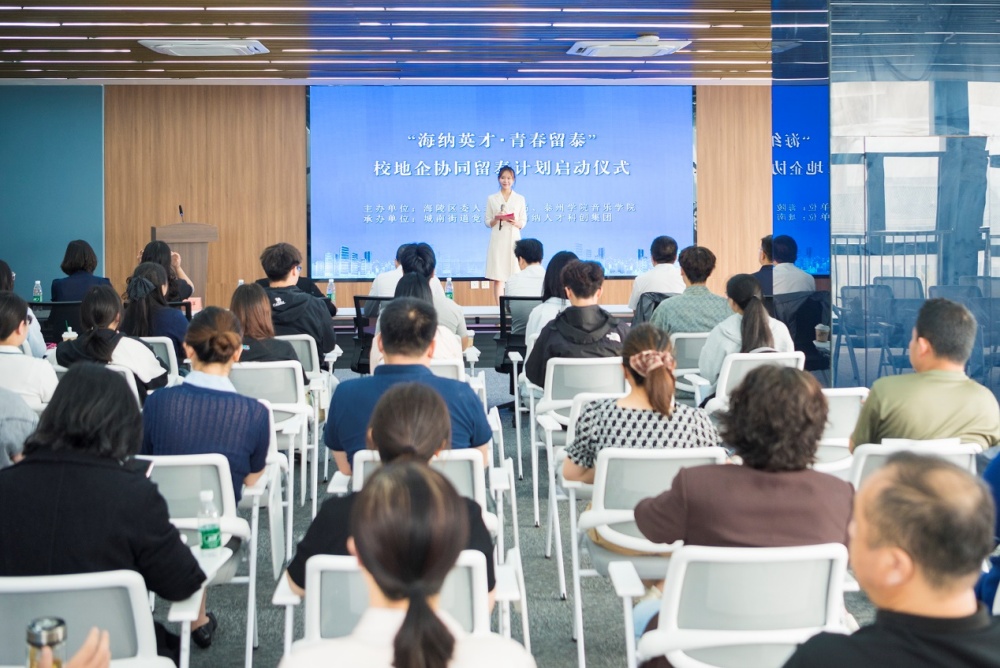 9月30日上午,音乐学院与海陵区人才工作局、城南街道、海纳人才科创集团在泰州市青年和人才一站式服务中心共同启动“海纳英才·青春留泰”项目合作仪式。海陵区人才工作局局长吴志军,城南街道党工委书记姜军、副书记徐雅静,音乐学院党总支书记陈鹏、院长孙菡,海纳人才科创集团董事长、总经理李军丽,以及音乐学院实习生和留泰毕业生代表等共同出席活动。