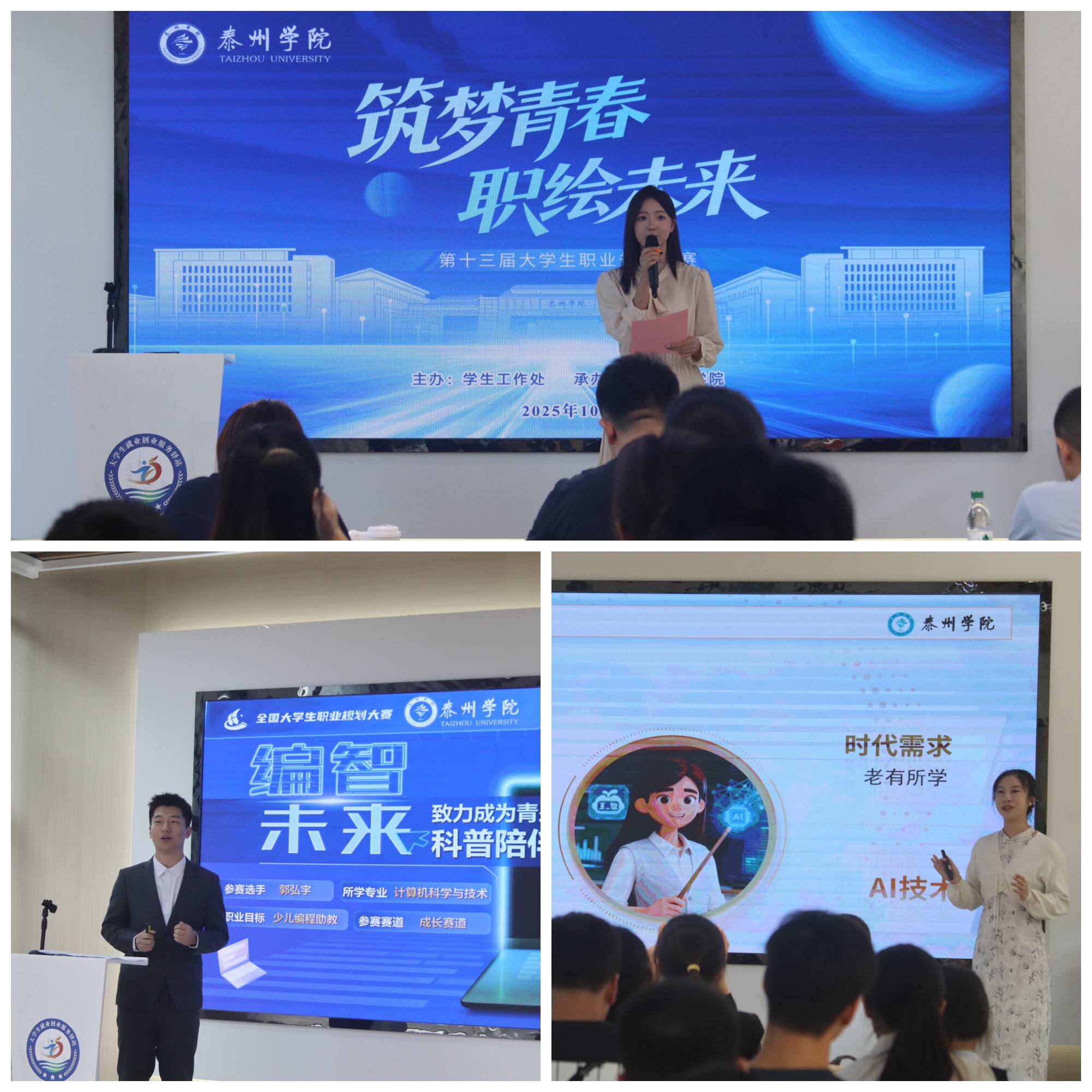 比赛现场,成长赛道选手们展现出鲜明的职业规划特色,其职业目标紧密贴合银龄经济、文旅经济等新兴业态发展方向,选手们通过系统梳理行业发展趋势、精准分析个人核心优势、详细阐述实践积累成果,以富有感染力的表达,清晰呈现了个人职业成长蓝图;就业赛道选手们则聚焦新质生产力发展背景下的前沿就业方向,围绕AI技术应用、军工技术研发、智能制造创新等领域,深度融合专业知识学习与现代科技发展需求,凭借出色的舞台表现力与逻辑清晰的规划方案,生动勾勒出未来职业发展路径。最终,外国语学院郭思文、机电工程学院吴文博等9名选手获就业赛道奖项,信息工程学院郭弘宇、药学院顾朔华等12名选手获成长赛道奖项。