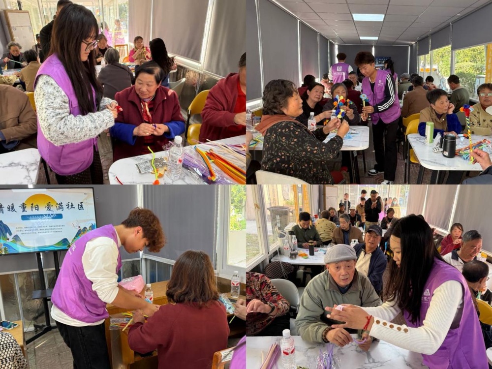 在新莲花社区,活动以“专属文艺慰问”为核心,同学们聚焦90岁以上高龄老人的精神需求,用精心准备的民乐演奏与经典老歌,送给老人们温暖。老人们或跟着节奏轻轻点头,或抬手擦拭眼角的泪光,一幕幕温馨场景,让“陪伴”成为最动人的节日礼物。在凤凰社区,活动通过“艺术欣赏+互动体验”双重形式,同学们不仅为老人们带来经典老歌、小提琴、笛子独奏等节目,还分组指导30位社区老人制作扭扭花手工作品。老人们在轻松愉悦的氛围中完成了属于自己的节日礼物,这份礼物是他们重阳佳节里最特别的纪念。
