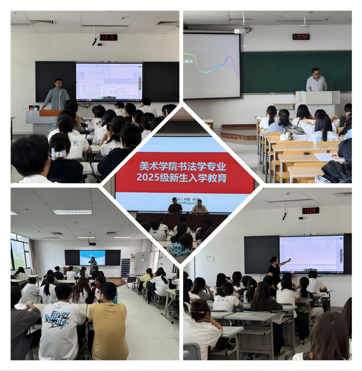 专业教育先行,筑牢认知“第一站”。入学后,美术学院按专业分类开展新生专业教育,为不同专业新生量身打造专业认知启蒙课堂。各系主任围绕专业定位、人才培养方案及行业发展前景展开深度解读,不仅帮助新生梳理出清晰的专业成长框架,更注重引导他们培养审美素养与创作思维。副院长何鑫鼓励新生既要深植传统经典,夯实笔墨根基与理论基础;又要主动涵养开阔的学科视野,积极关注、探索书法与新兴业态融合的无限可能。周莉、王望峰、张蓓蓓等老师细致入微的讲解,让新生们迅速打破对专业的陌生感,精准锚定大学阶段的学习重点,明确了个人成长与专业发展的结合方向,为后续专业学习筑牢认知根基。
