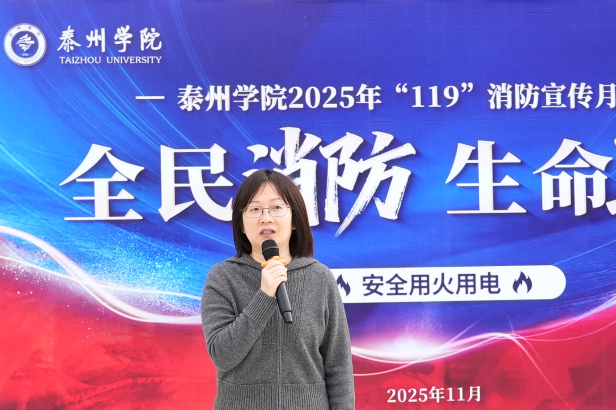 为切实提升校园火灾防控能力,11月9日下午,在第34个全国消防安全宣传教育日来临之际,学校联合泰州市海陵区消防救援大队,在图书馆北广场组织开展2025年“119”消防疏散灭火演练。校党委常委、副校长卜慧芬担任总指挥。保卫处、实验室与设备管理处、学生工作处、信息工程学院、机电工程学院、美术学院、药学院、化学化工与材料工程学院、高教后勤等相关单位师生员工600余人参加演练。