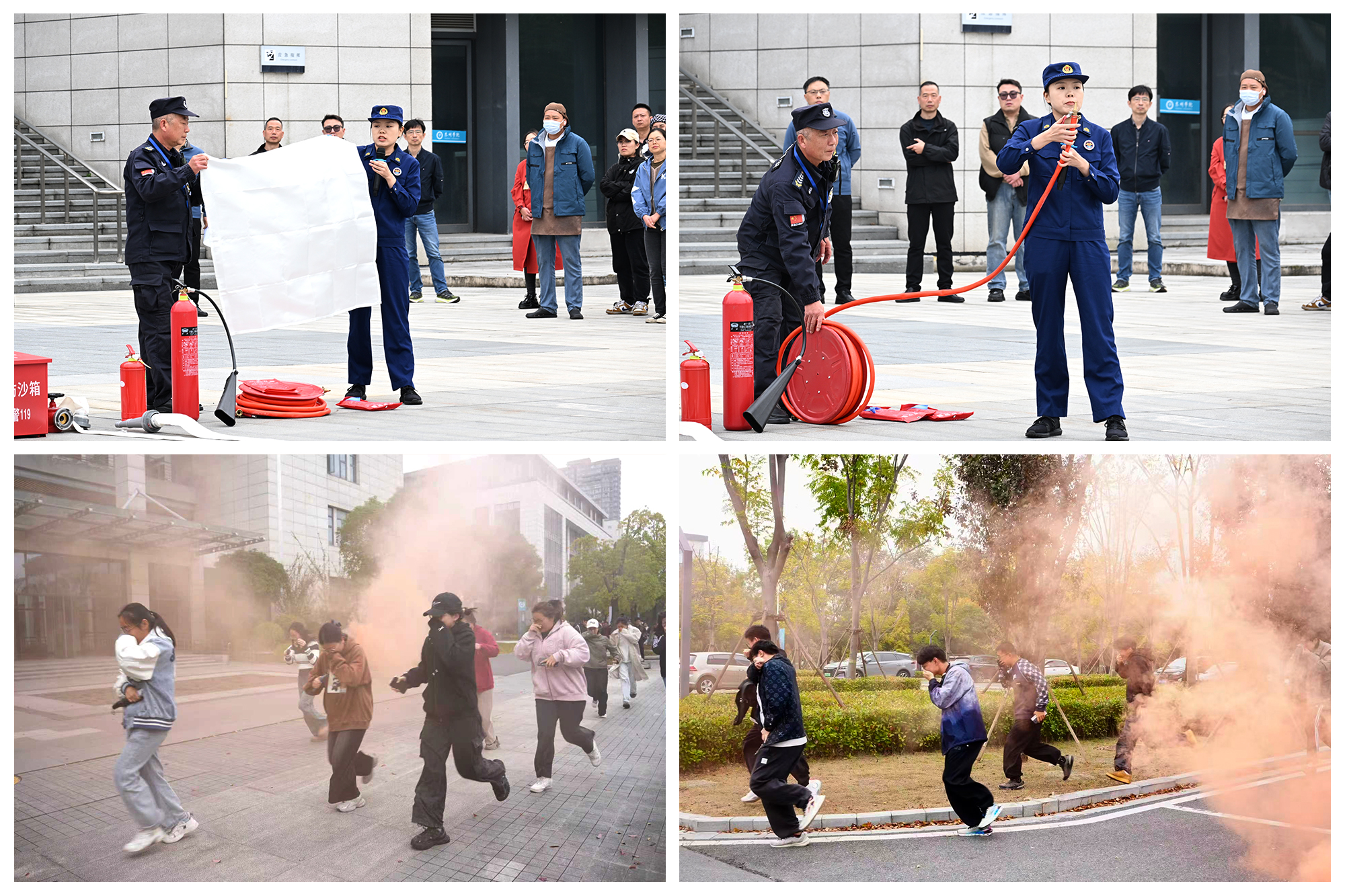 演练模拟实验室发生火情,校园内警报声迅速响起。参演师生按照应急疏散预案,捂住口鼻,弯腰低姿,沿着指定逃生路线快速、有序撤离。整个过程紧张而不慌乱,疏散路线清晰,职责分工明确。最终,师生员工在规定时间内安全抵达疏散集合点。