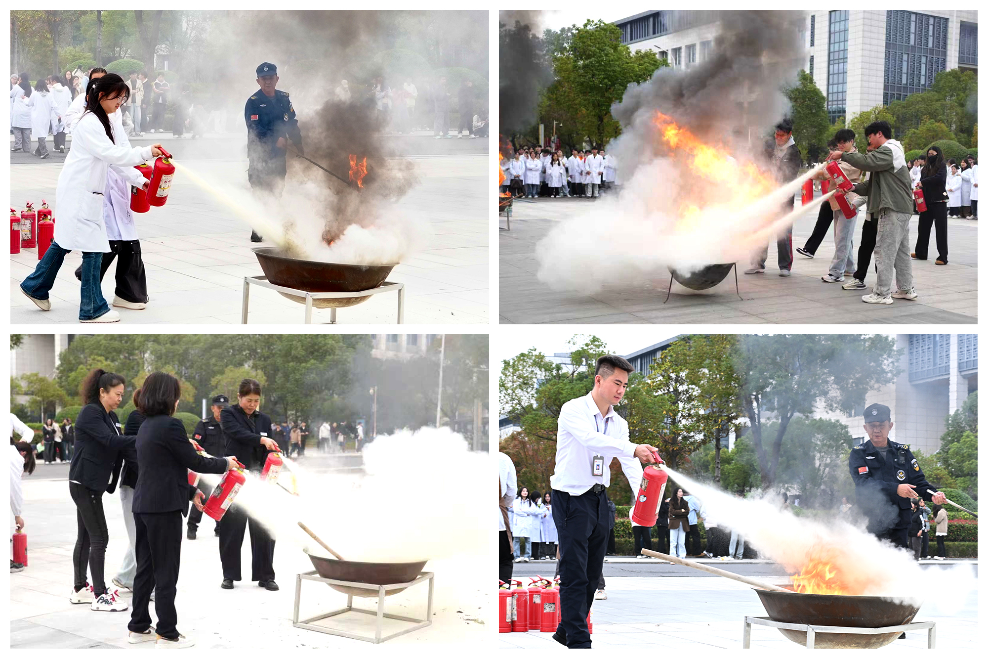 随后,泰州市海陵区消防救援大队教官徐若凡通过实物演示,向师生员工讲解各类灭火器材使用原理、重点介绍了实验室初期火灾处置的关键时机与操作规范。理论讲解结束后,师生依次拿起灭火器进行灭火实战演练。