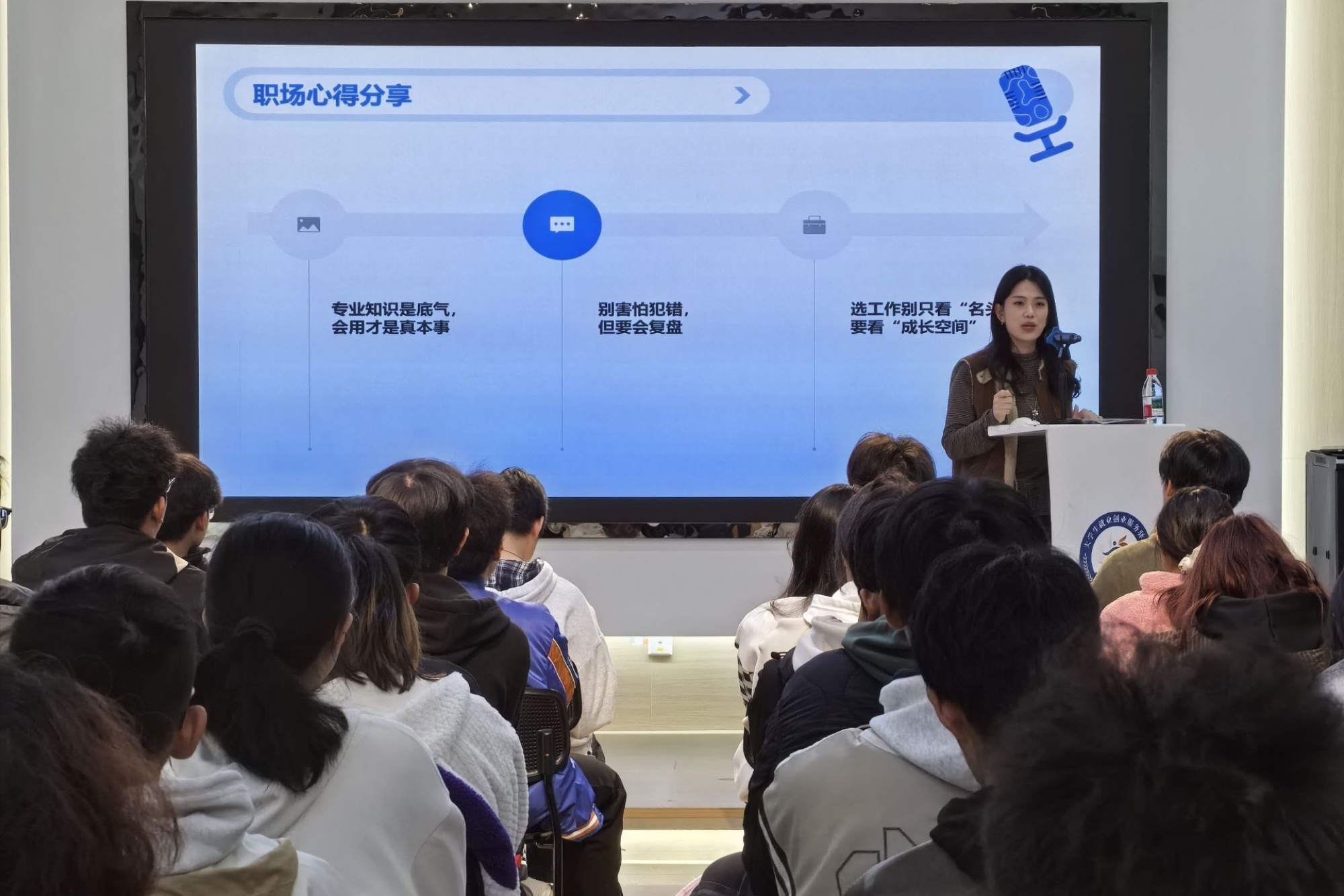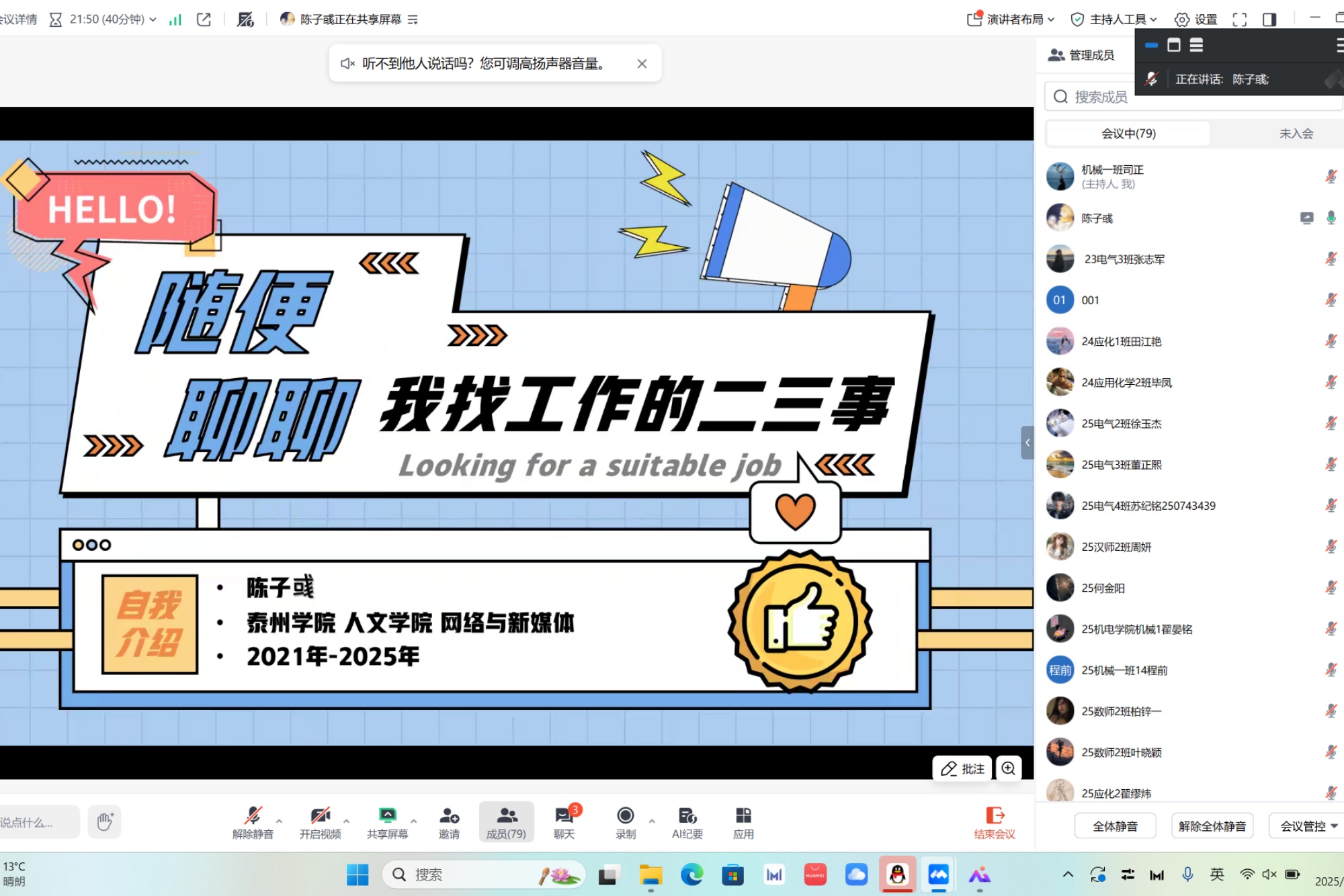 活动中,信息工程学院刘静雅聚焦“求职技巧与面试加分项”,分享企业求职中的重点、注意事项和面试沟通话术,鼓励同学们勇于尝试、敢于试错,在竞争中脱颖而出;机电工程学院马家骥以“电气求职避坑指南”为题,为初入职场的新人敲响警钟,生动阐释了专业不等于枷锁,电气背景同样能在精密制造领域大放异彩;人文学院陈子彧通过线上分享的方式,讲述了其就业过程的实战经验、薪资构成、劳动合同、五险一金等工作常识,勉励即将就业的学子们脚踏实地、积极就业。