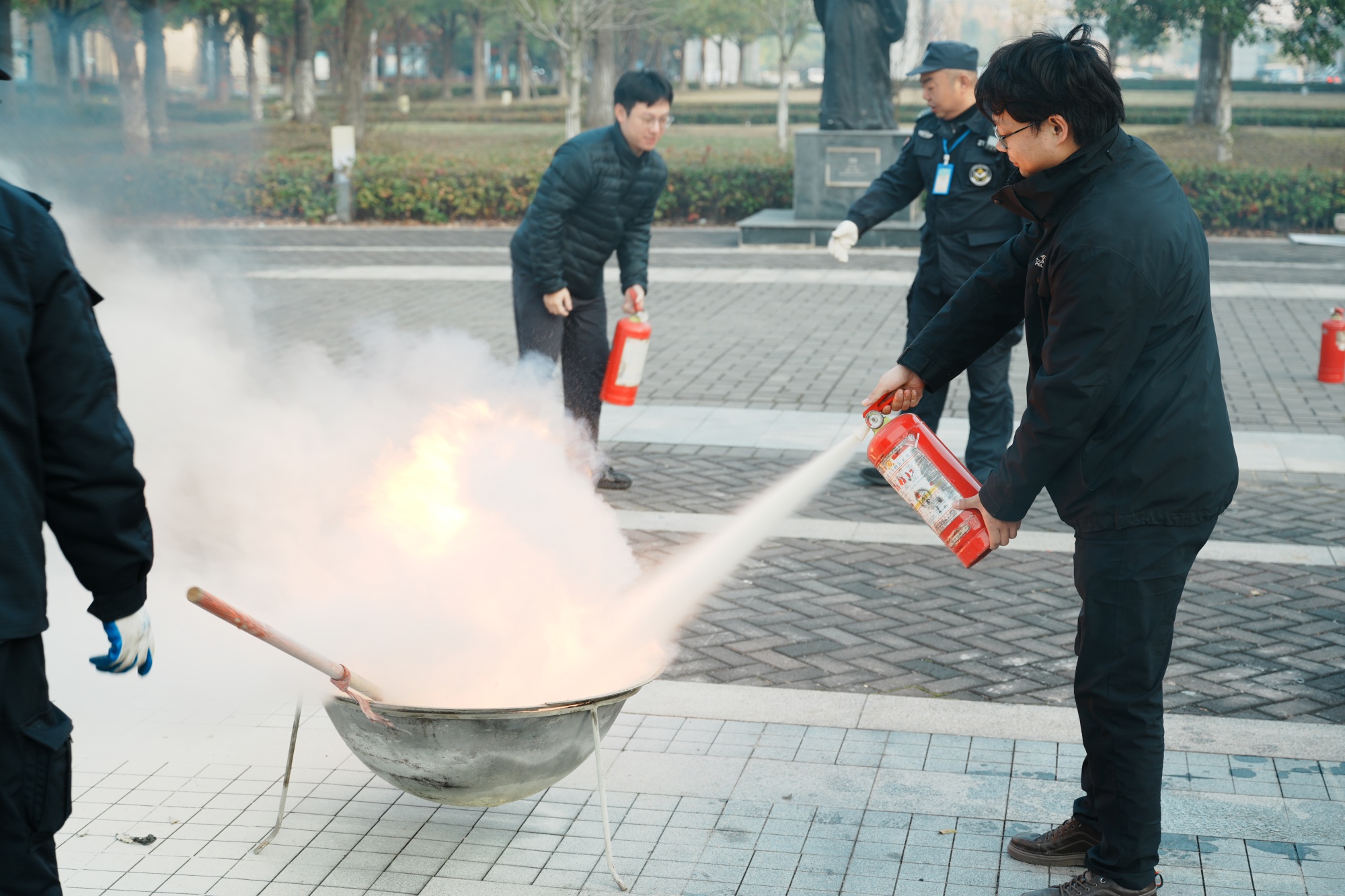 活动现场,师生代表开展消防灭火实战演练,让大家在实践中掌握灭火器“提、拔、握、压”的正确使用方法,切实提升应急处置能力。
