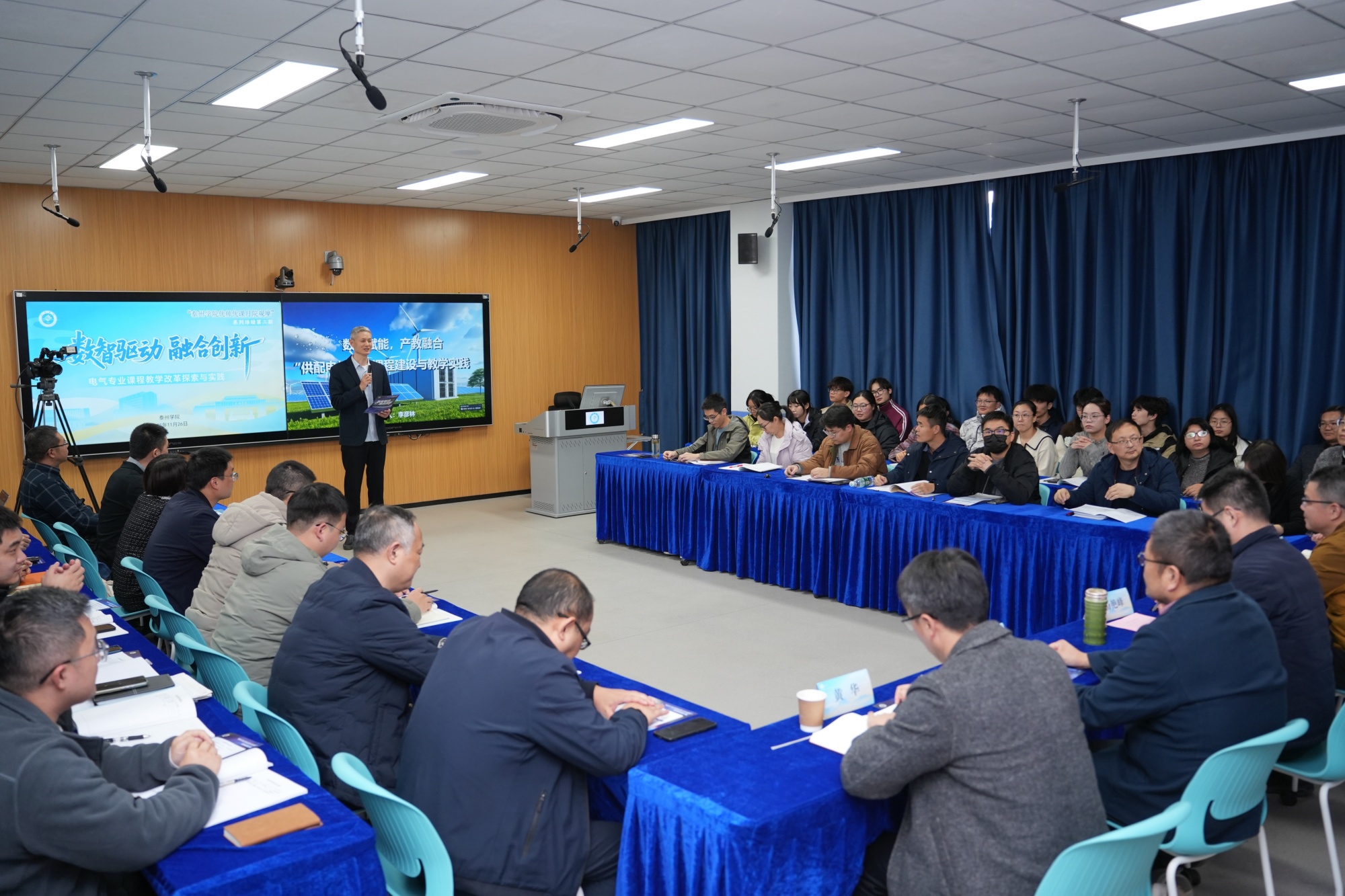 11月26日下午,由校教务处主办、机电工程学院承办的“月院观摩”系列活动第二期在博雅楼G3202顺利举行。本次活动以“数智驱动,融合创新:电气专业课程改革探索与实践”为主题,通过课程汇报、交流研讨与专家点评等多种形式,集中展示了电气专业在数字化与智能化转型背景下的课程建设,及围绕“以产教融合为径、以工匠精神铸魂”的教学实践。活动邀请南通大学电气与自动化学院院长张新松教授,江苏远望仪器集团有限公司副总经理、总工程师、省产业教授程鲲鹏现场指导,校党委常委、副校长汤艳峰出席活动,教务处负责人、机电工程学院全体教师参与观摩,活动同步面向全校进行线上直播。活动由机电工程学院院长许胜主持。