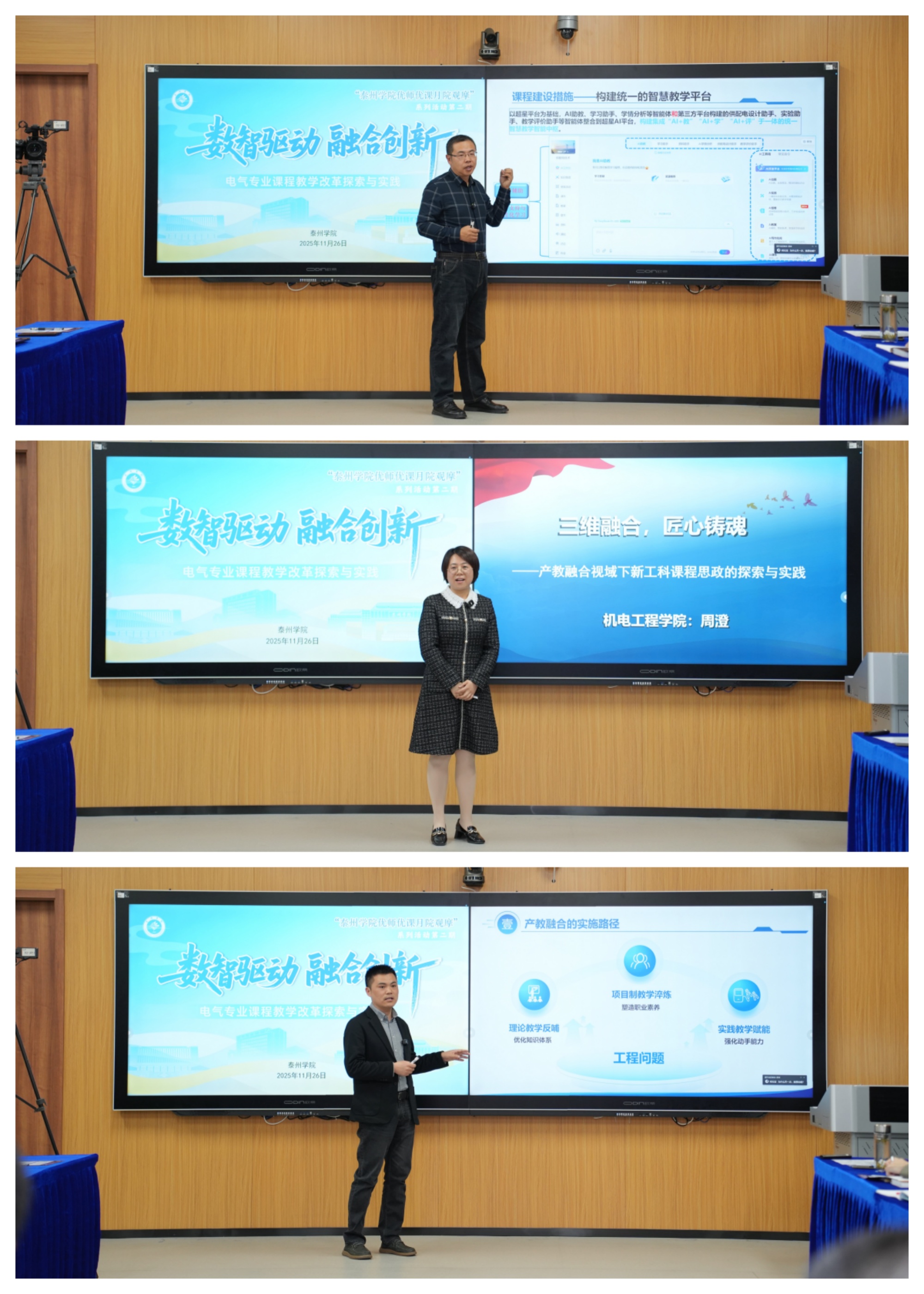 周澄老师以“三维融合,匠心铸魂”为题,探讨了在产教融合视域下电气专业新工科课程思政的实践路径。将职业素养、工匠精神与技术创新能力融合培养,通过案例教学与项目引导,实现价值塑造、知识传授与能力培养的有机统一。