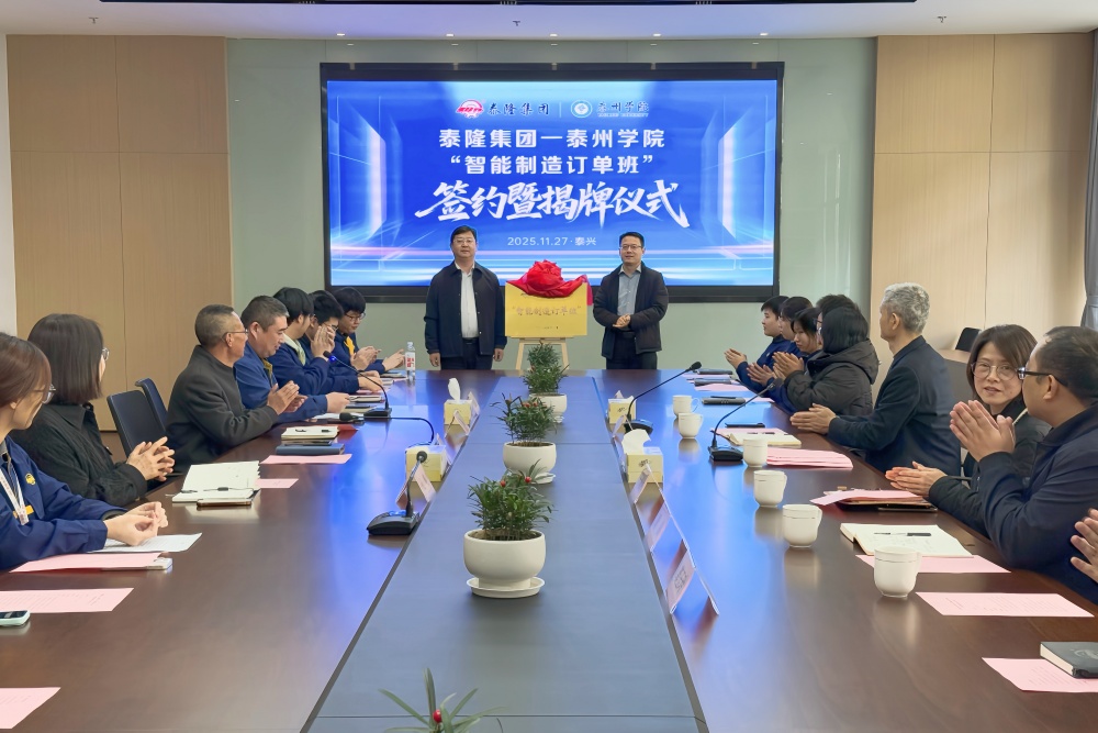 为深入践行“三融三促”校地共建体制机制,推动产教融合从“表层联动”迈向“深度共生”,精准匹配装备制造产业人才需求,11月27日下午,校党委常委、副校长汤艳峰带领机电工程学院相关人员及首届“智能制造订单班”20名学生,赴泰隆集团开展“订单班”签约揭牌仪式,共同擘画校企协同育人新蓝图。泰隆集团总经理殷爱国、总工程师孔霞等领导接待来访。