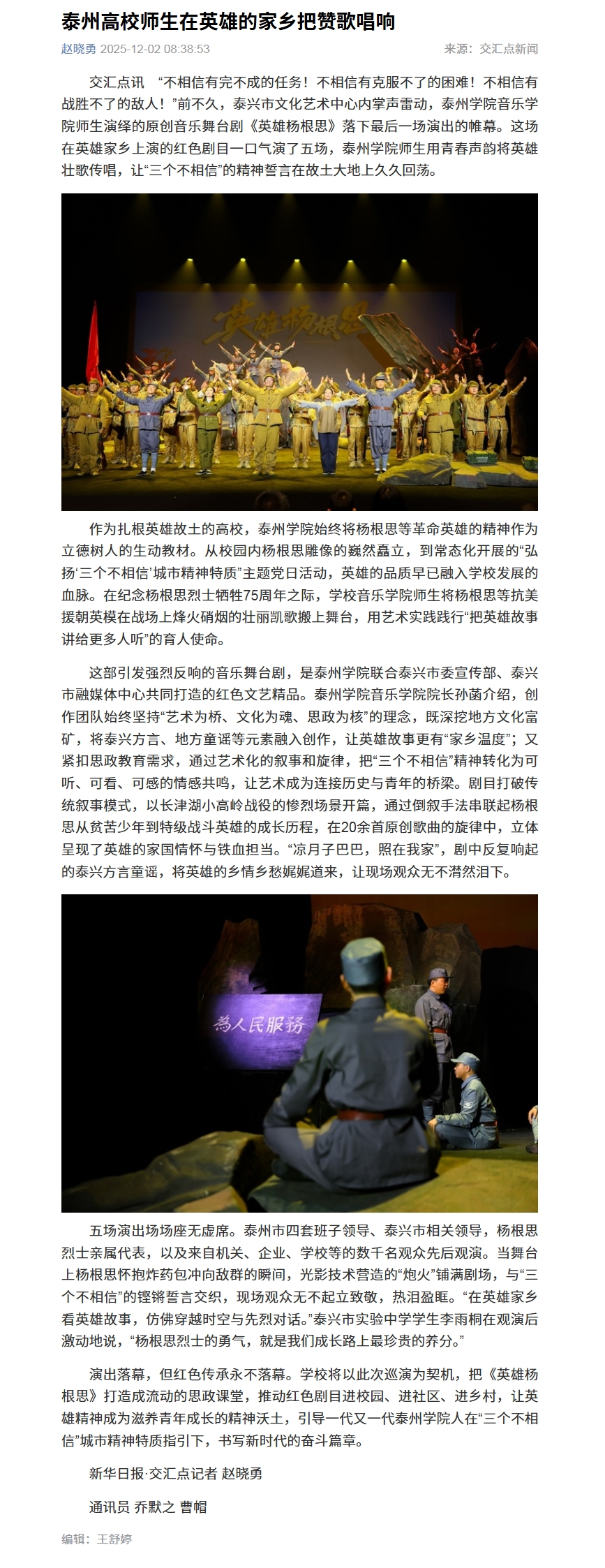 《交汇点》2025年12月2日报道《泰州高校师生在英雄的家乡把赞歌唱响》