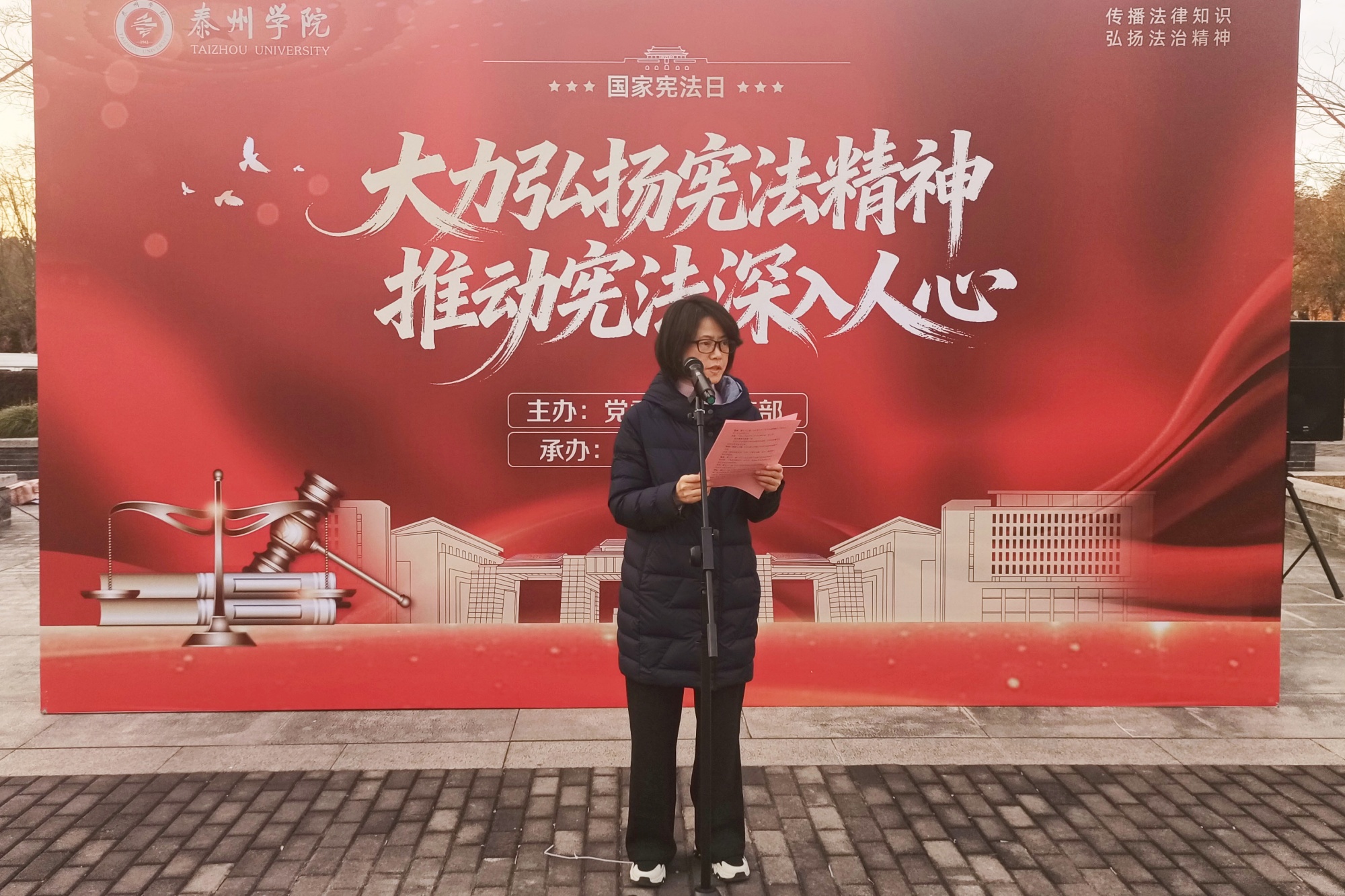 12月4日,由党委学生工作部主办、机电工程学院承办的“大力弘扬宪法精神,推动宪法深入人心”主题升旗仪式在胡瑗广场举行。机电工程学院党总支书记于晓萍、副书记、副院长董卫华及师生代表100余人参加仪式。