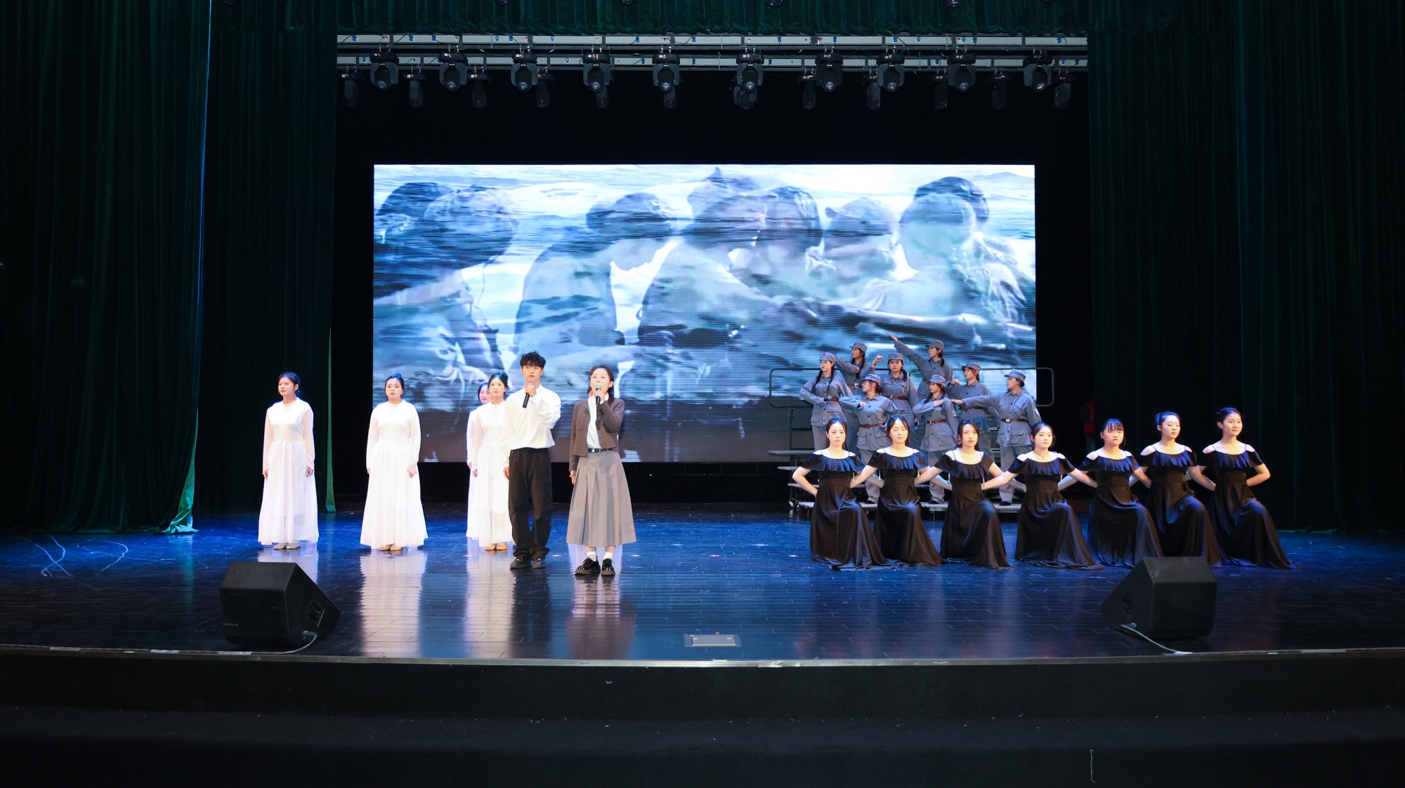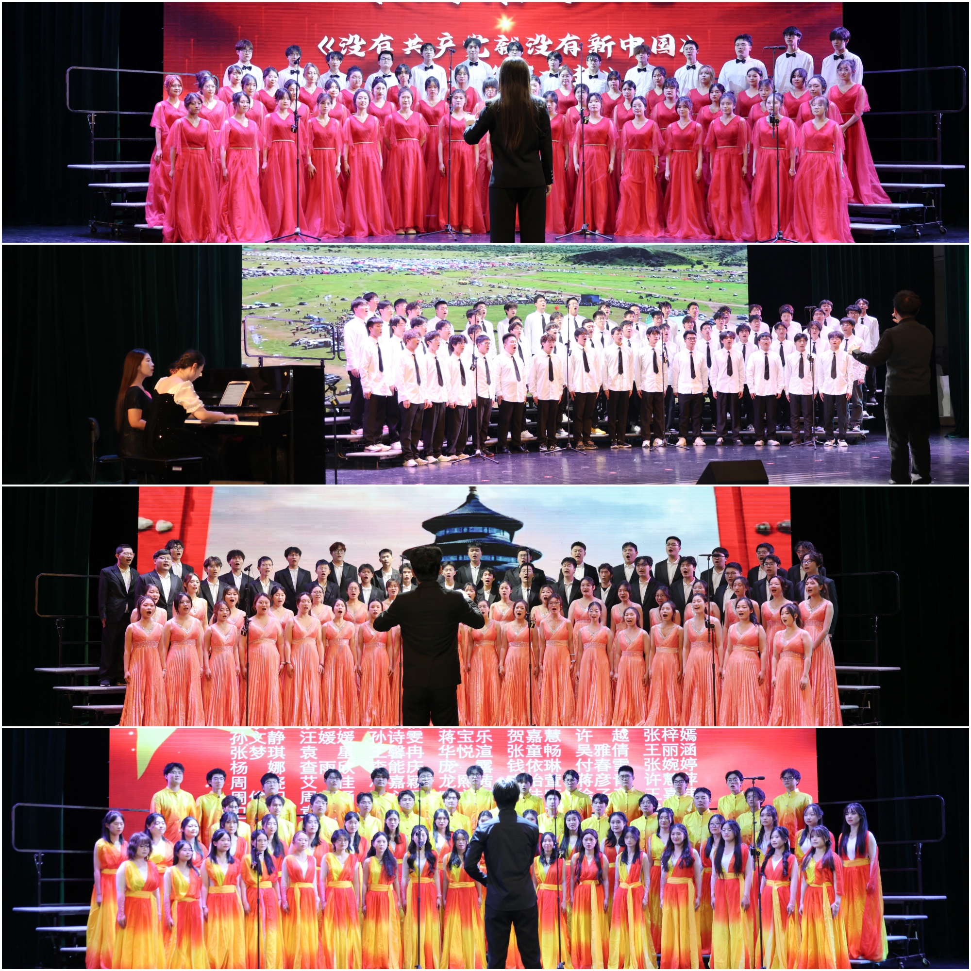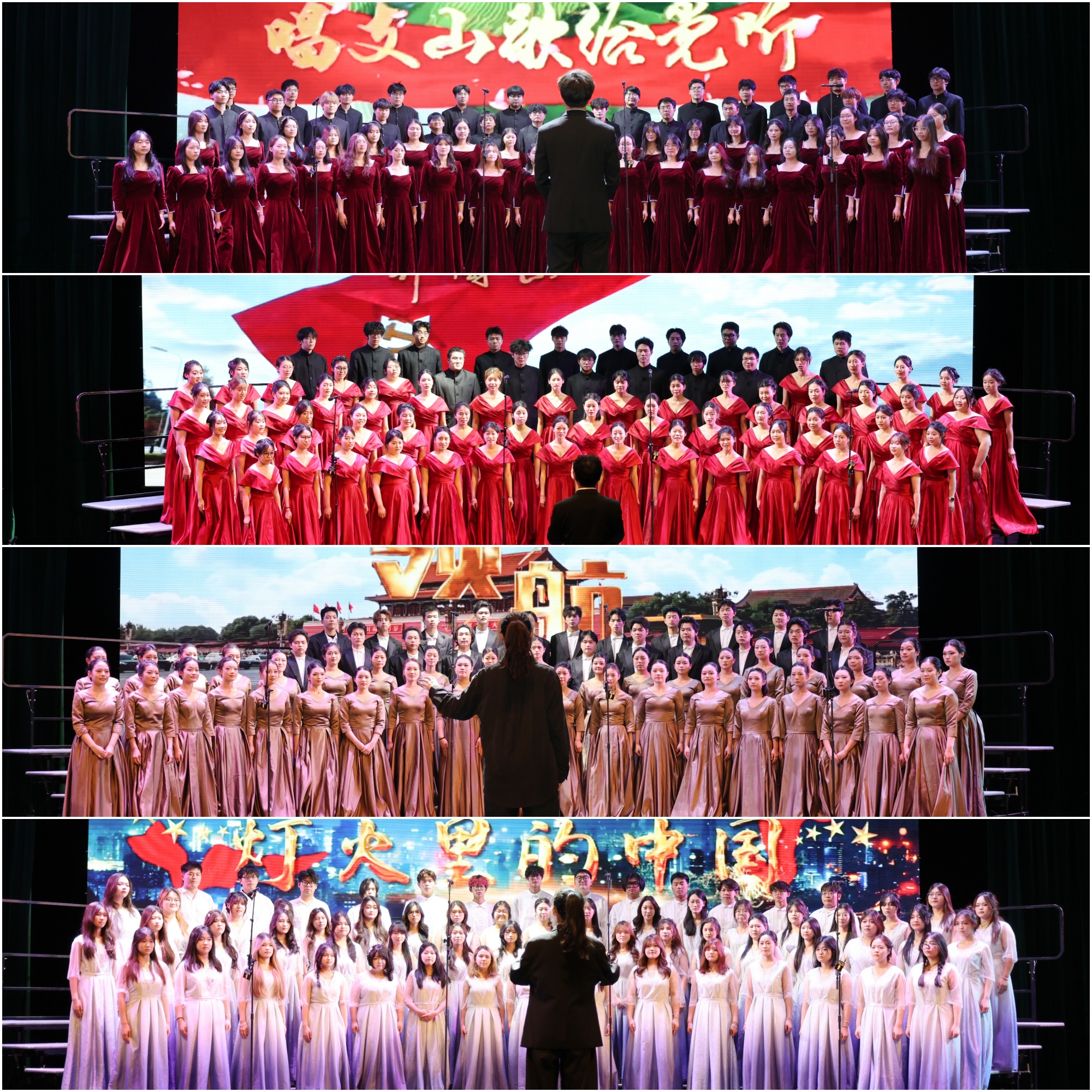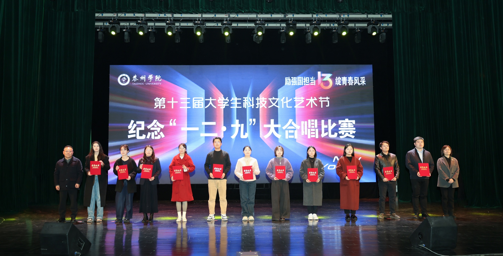 卜慧芬、魏小星为纪念“一二·九”大合唱比赛的获奖队伍颁奖。比赛中,来自全校11个二级学院的代表队依次登台,演唱了精心准备的两首参赛曲目,以歌声致敬峥嵘历史、以旋律礼赞伟大时代。最终,音乐学院、数理学院、人文学院获得大合唱比赛一等奖,外国语学院、机电工程学院、化学化工与材料工程学院和信息工程学院获得二等奖,经济与管理学院、教育科学学院、药学院和美术学院获得三等奖。