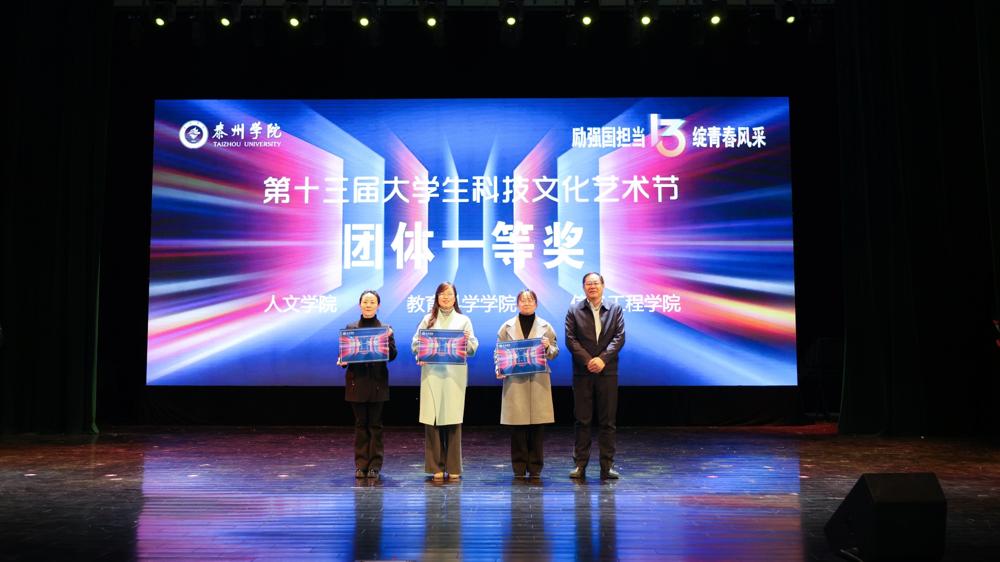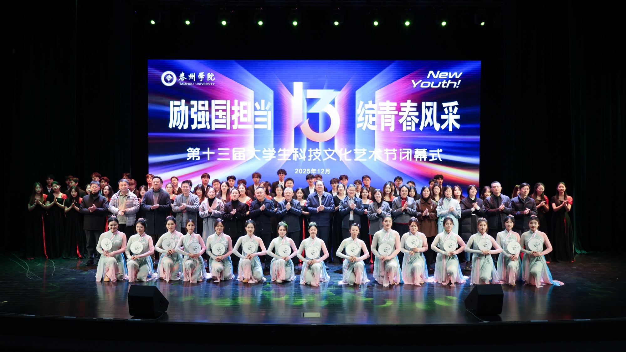 闭幕式现场,师生们通过一段VCR回顾了本届科技文化艺术节的难忘瞬间,从竞技场上的激烈角逐,到充电站里的活力补给,再到各学院“一院一品”的特色展示,全方位呈现了泰院学子的拼搏精神与青春活力。随后,教育科学学院带来集体朗诵一等奖作品《穿越时空的对话》,人文学院带来集体舞一等奖作品《淡妆浓抹总相宜》,以多元艺术形式展现了本届科技文化艺术节的丰硕成果。艺术节闭幕式在激昂的校歌声中落下帷幕。