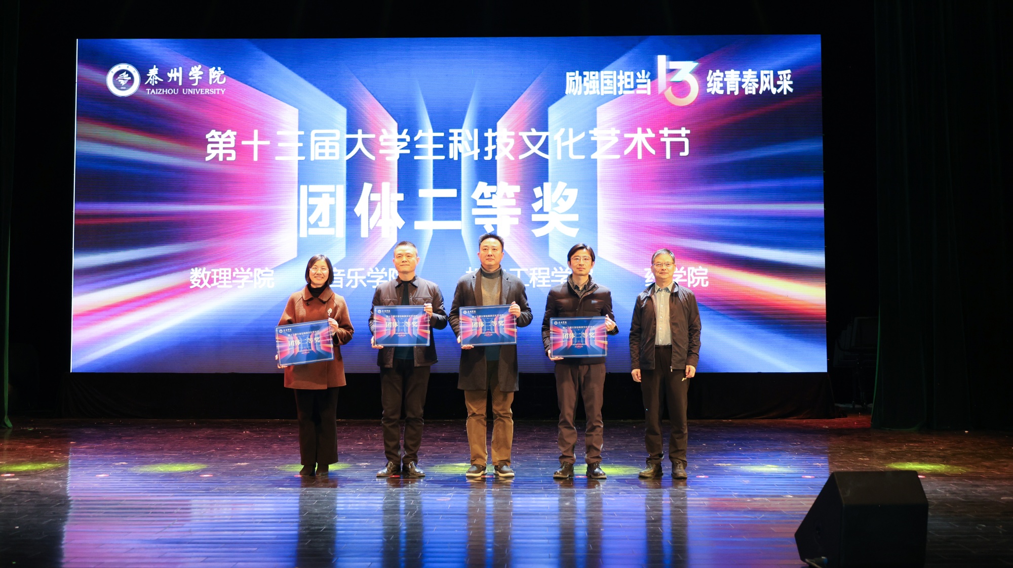 闭幕式上,徐向明为获得本届大学生科技文化艺术节团体一等奖的教育科学学院、信息工程学院和人文学院颁奖;冯锋为获得团体二等奖的音乐学院、机电工程学院、数理学院和药学院颁奖;徐庆国为获得团体三等奖的外国语学院、化学化工与材料工程学院、美术学院和经济与管理学院颁奖。