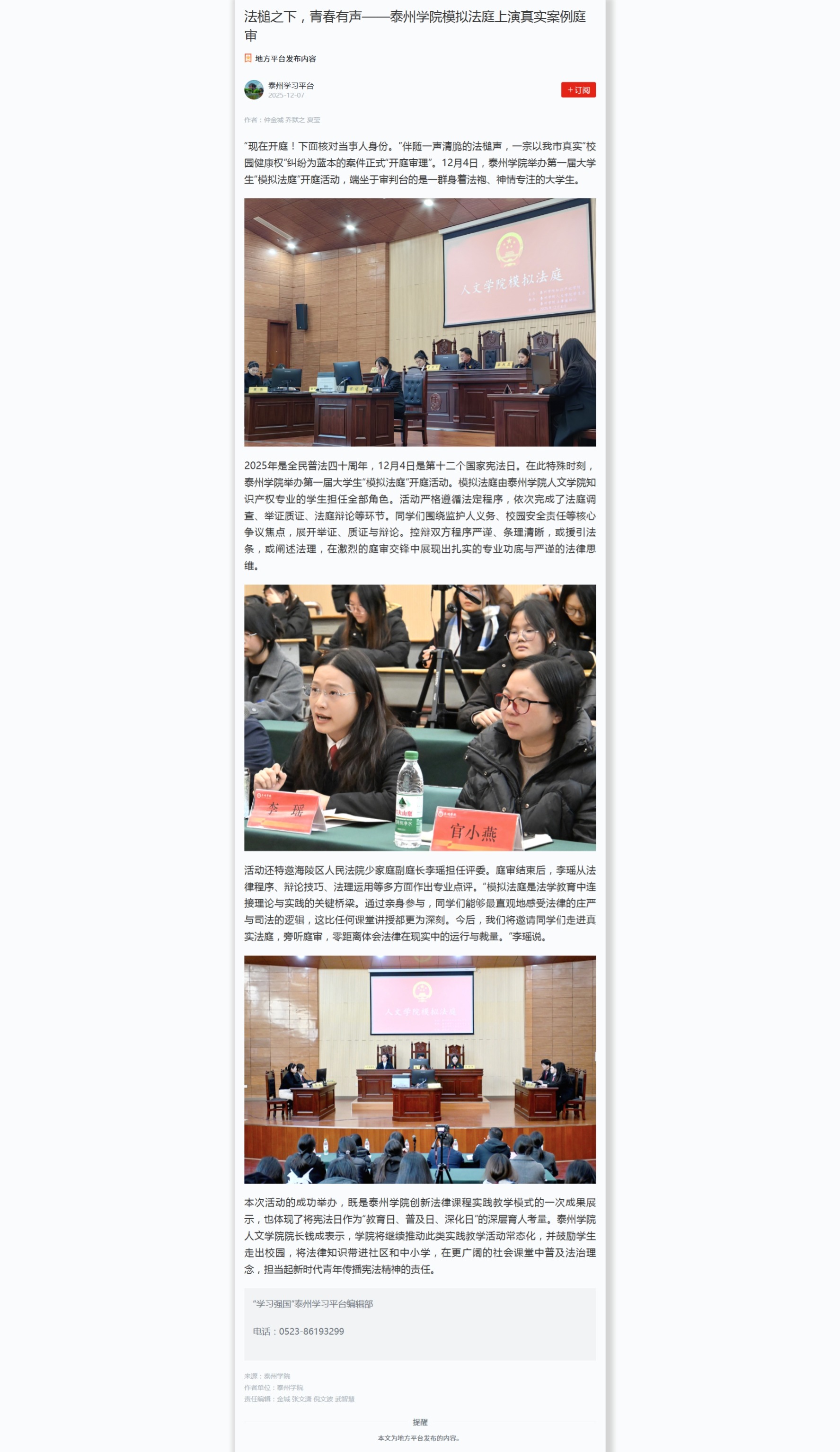 《学习强国》2025年12月7日报道《法槌之下,青春有声——sunbet申搏官方网站模拟法庭上演真实案例庭审》