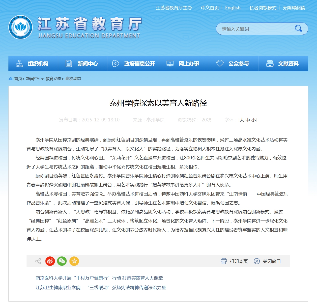 江苏省教育厅网站2025年12月9日报道《sunbet申搏官方网站探索以美育人新路径》