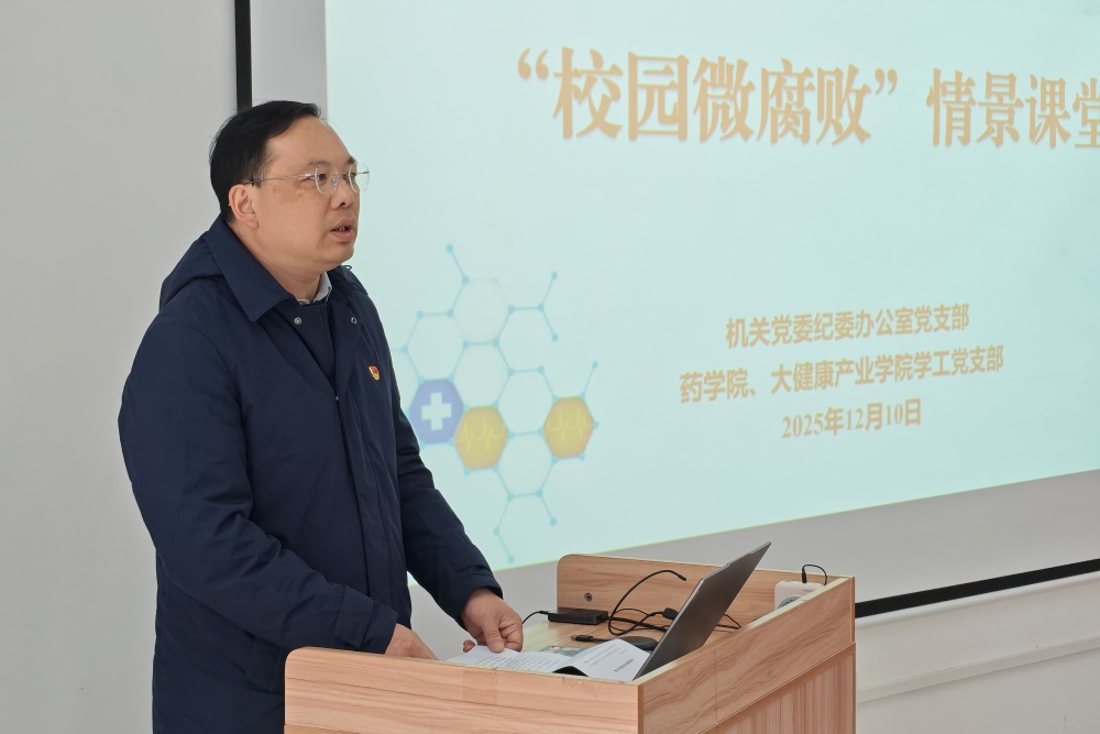 活动中,药学院学工办老师对学校各项资助政策进行了系统解读,帮助学生准确理解政策内涵、用好资助资源。随后,校纪委办公室副主任王凯以“谨防校园‘微腐败’”为主题开展情景课堂,通过案例讲解引导学生树立廉洁自律意识,增强规矩意识和诚信意识。