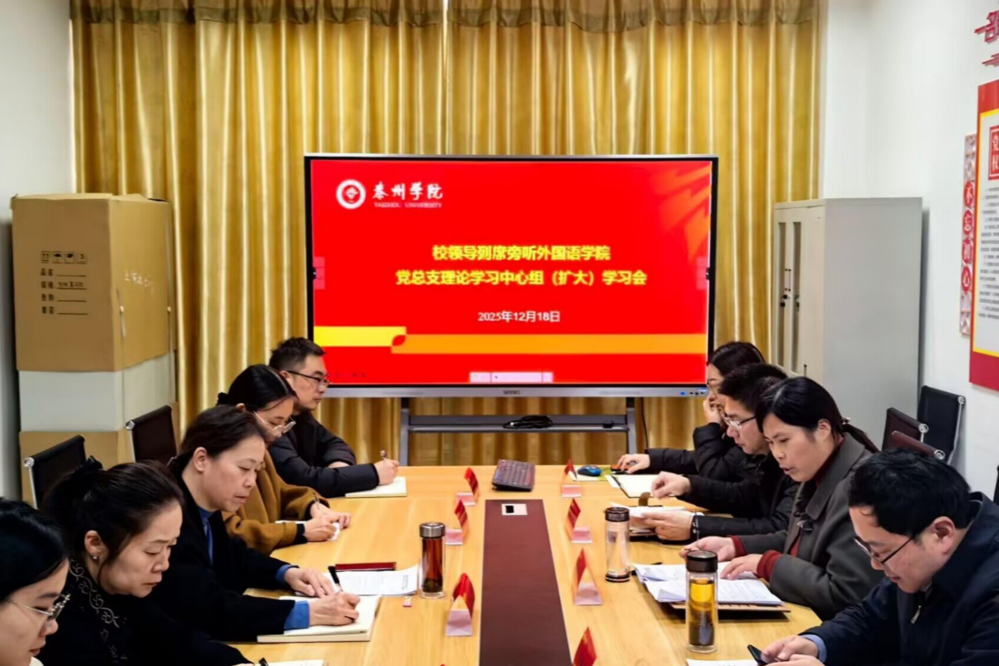 12月18日下午,外国语学院党总支理论学习中心组(扩大)学习会在明达楼D2331会议室召开。校党委常委、副校长赵晓兰列席旁听指导。会议由学院党总支书记练红珍主持,党总支理论学习中心组全体成员、科级干部、党支部书记、系(教研室)主任等参加学习。
