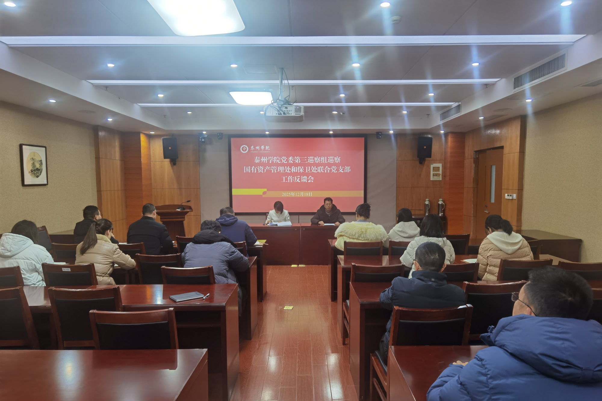 第三巡察组全体成员,国有资产管理处和保卫处联合党支部全体成员参加会议。