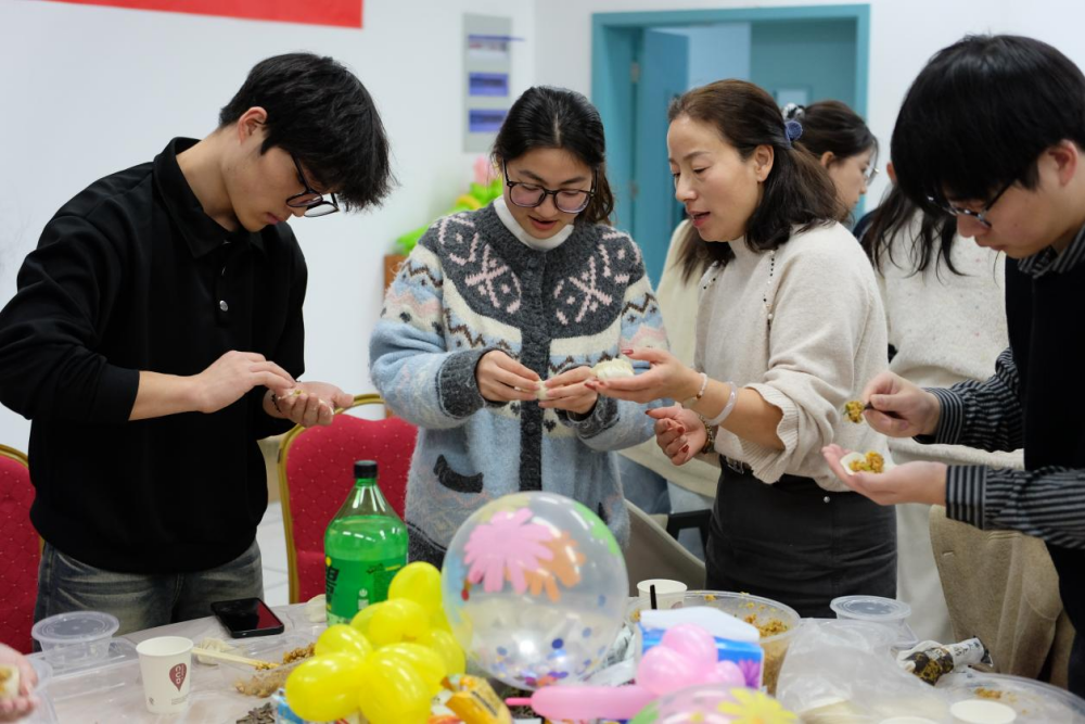 活动现场暖意融融,同学们分组开展包饺子活动,既有速度比拼的默契协作,也有创意造型的巧思雕琢,形态各异的饺子饱含师生温情。随后,师生围坐分享亲手制作的水饺,温热滋味驱散冬日寒意,拉近心灵距离。互动游戏环节将氛围推向高潮,定制蛋糕的惊喜登场引发阵阵欢呼,师生共同分享甜蜜、参与趣味游戏,现场处处洋溢着蓬勃的青春朝气,欢声笑语间尽显相聚的喜悦与惬意。