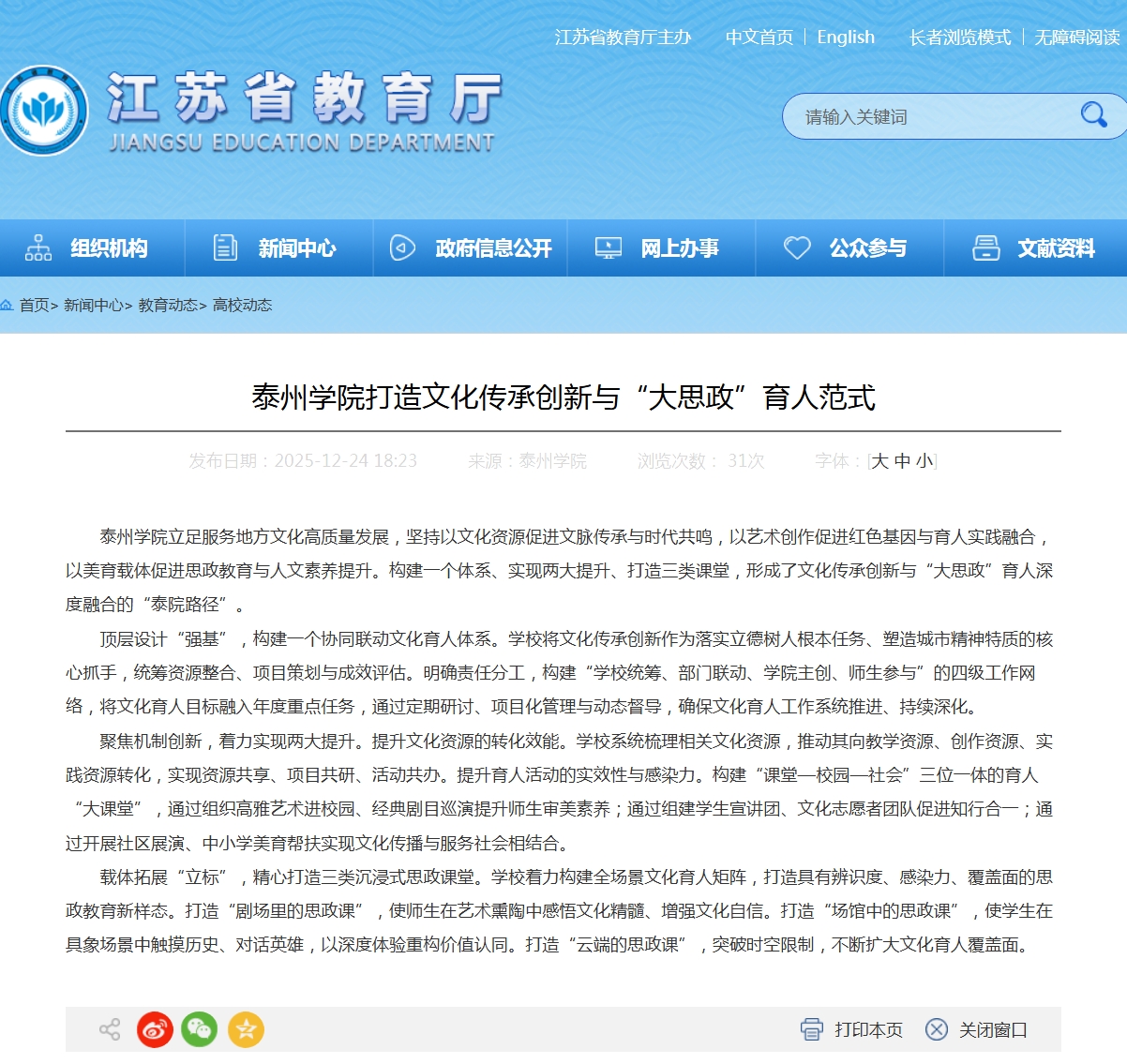 江苏省教育厅网站2025年12月24日报道《sunbet申搏官方网站打造文化传承创新与“大思政”育人范式》