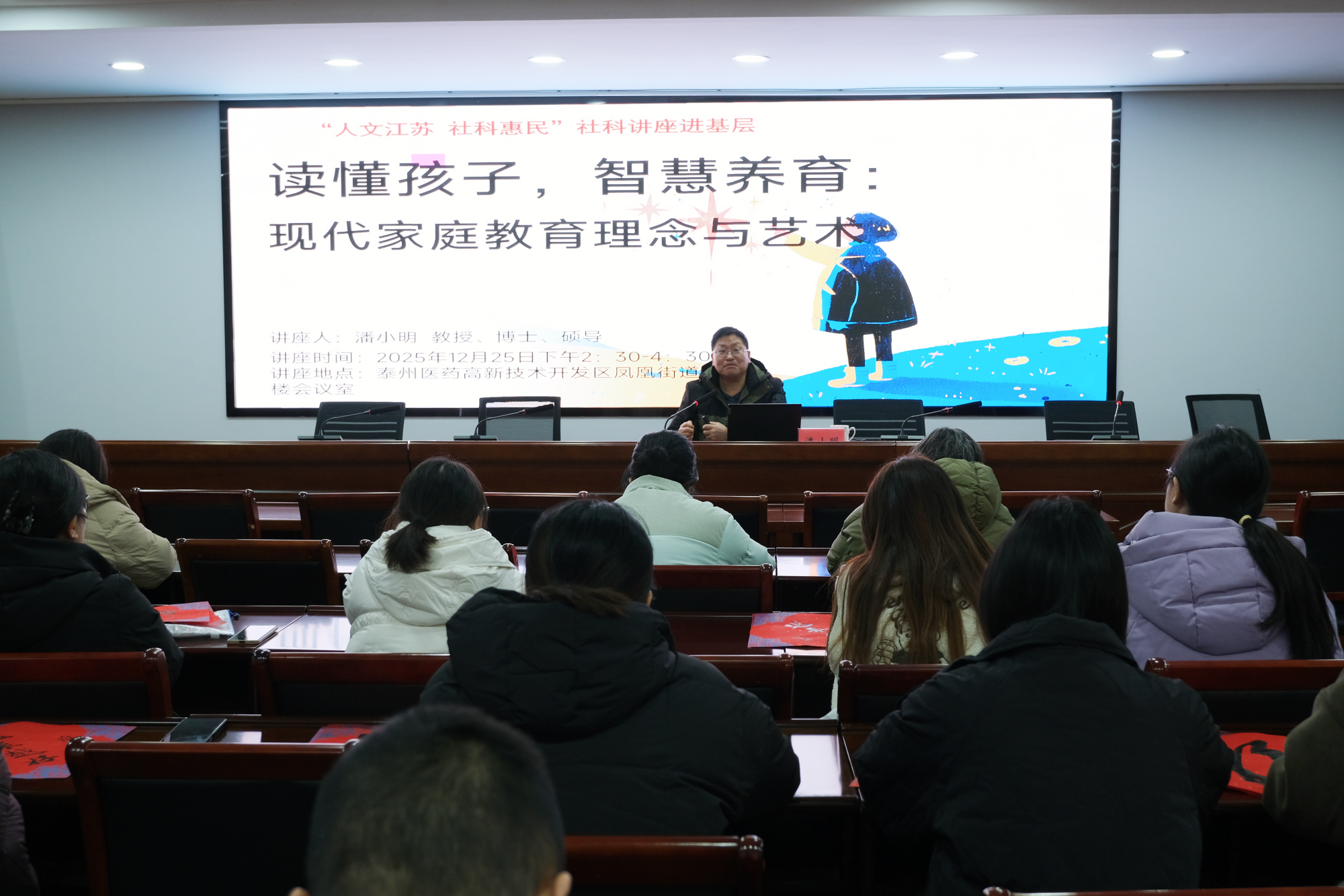 12月25日下午,由江苏省社科联主办的“人文江苏·社科惠民”社科讲座进基层活动走进泰州医药高新区凤凰街道,教育科学学院院长潘小明受邀作《读懂孩子,智慧养育:现代家庭教育理念与艺术》的专题讲座,为社区居民、教师代表带来了一堂别开生面的家庭教育。