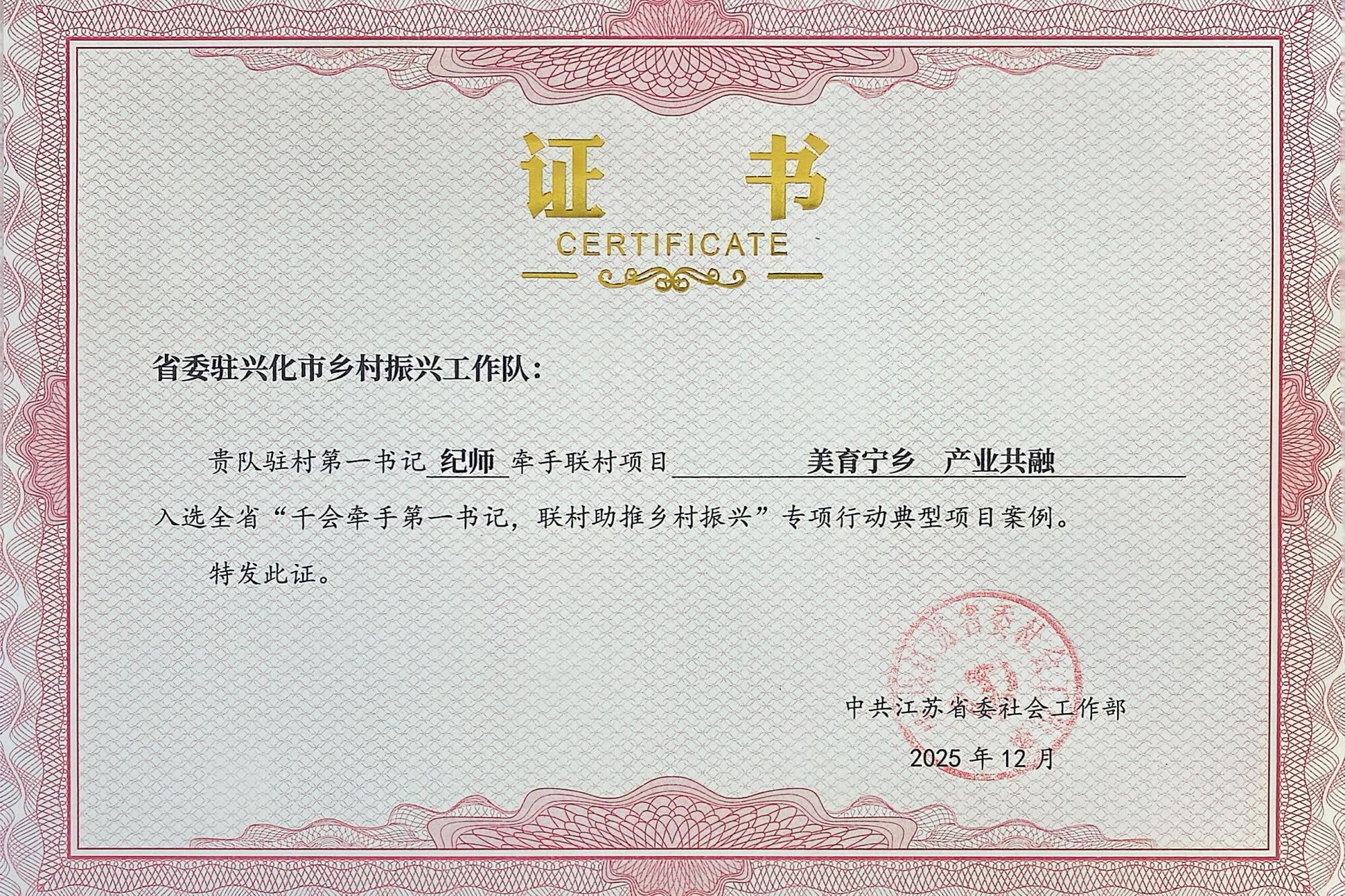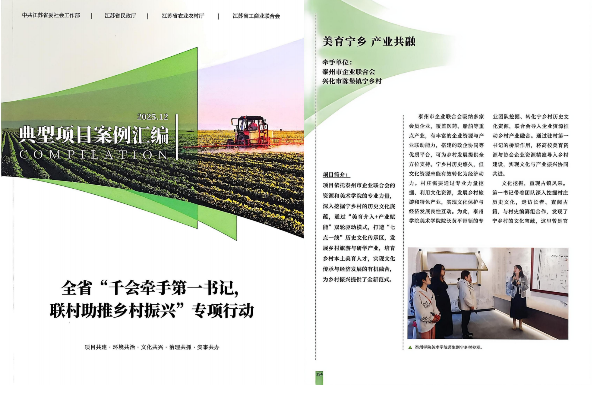 会议发布了典型项目案例并向入选单位颁发证书。纪师作为陈堡镇宁乡村第一书记,联合泰州市企业联合协会报送的“美育宁乡 产业共融”项目,在全省200多个优秀项目中脱颖而出,成功入选专项行动典型项目案例。