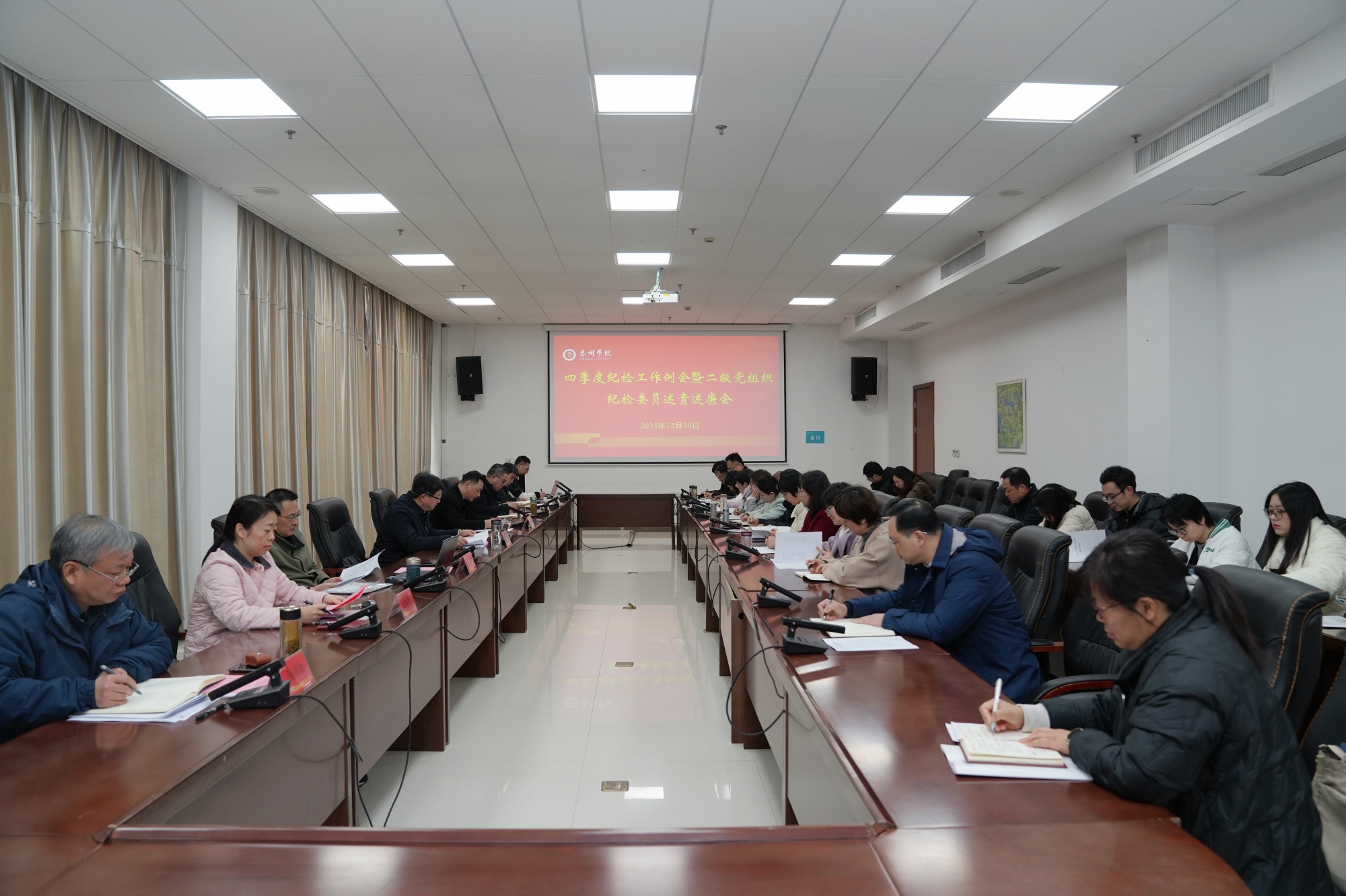 会议期间,信息工程学院、外国语学院、经济与管理学院、马克思主义学院党总支纪检委员作现场述责述廉,其他二级党组织纪检委员作书面交流。与会人员结合述责述廉报告内容及日常工作实绩,进行了现场测评打分。会议还集中学习了12月25日召开的中共中央政治局会议精神,通报了2025年度学校纪检监察工作总结,围绕廉政风险排查工作主题进行了第四期“学廉大讲堂”分享。