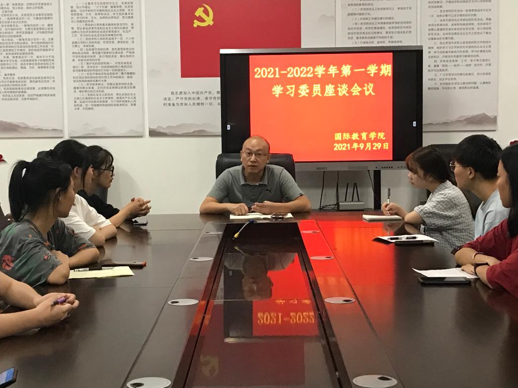 本站讯(国际教育学院 学生记者 何雪琪)新学期开始,为了进一步了解我院学生学习状态,帮助同学们养成良好的学习习惯、营造浓厚的学习风气,国际教育学院于2021年9月29日晚19:30在科技综合楼401召开了本学期学习委员座谈会。会议由副院长肖勇主持,在校班级学习委员及部分学生代表共15人参加。