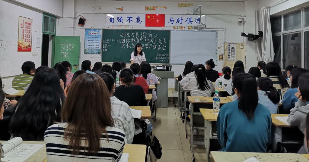 本站讯(国际教育学院 朱媛)为了帮助2021级学生更快适应校园生活,并明确自己的目标和方向,国际教育学院于10月11日晚在各新生班级教室开展了行为规范、理想目标教育专题学习会,本次专题学习由各班班主任主持,全部新生参与其中。