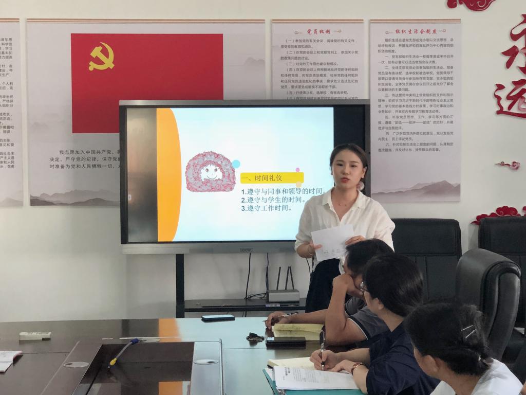 第一阶段由党总支书记刘海云书记主持。她带领全体教师认真学习了习近平给全国高校黄大年式教师团队代表的回信,并希望全体老师要认真学习领会习总书记的讲话精神,做到知行合一,当好学生成长的引路人。随后,由金岩老师为大家带来“教师礼仪”小课堂,她结合自身的感悟对“时间礼仪”、“纪律礼仪”和“交往礼仪”等方面进行了阐述。授课结束后,全体教师对新时代教师礼仪进行了讨论。