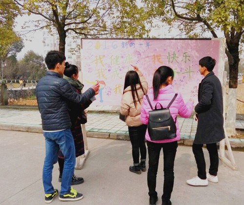在欣赏完书法作品之后,同学们在以“2016,我健康,我快乐,我奋斗,我进步!”为主题的留言板上,签上了自己的名字,表达了对新年的喜悦和期许。