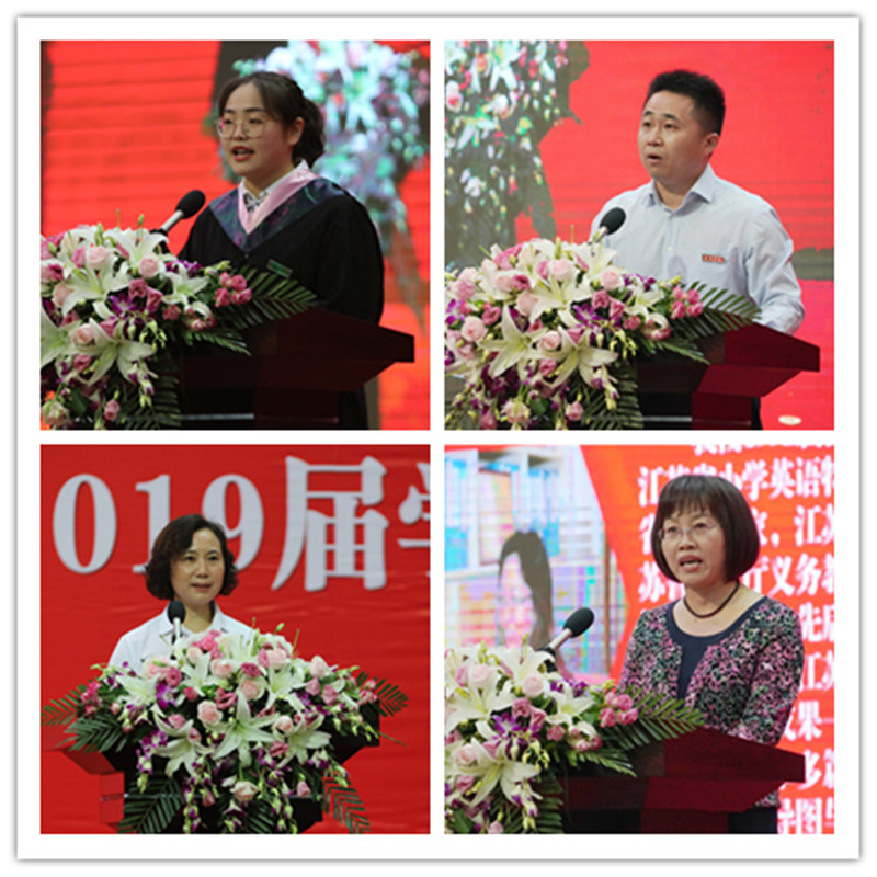 毕业生代表、教师代表、后勤人员代表、校友代表分别致辞。教育科学学院2019届毕业生黄梦如同学代表全体毕业生发言,她深情地回忆了在泰院生活和奋斗的四年,表达了对母校最美好的祝愿。数理学院陈小平代表全体教师发言,他围绕三个关键词“奋斗”“诚信”“学习”,表达了母校老师对毕业生的牵挂、眷恋和殷殷嘱托。宿管员朱秋红代表全体后勤人员发言,表达了他们对毕业生的关爱与不舍,感谢毕业生对后勤工作的理解和支持。1992届校友、第十三届全国人大代表吉桂凤代表校友发言,期望毕业生在追求中展望、学习中丰盈、思考中成长、实践中收获,争做各行各业的佼佼者。典礼现场,毕业生代表向家长代表、教职工代表、校领导敬献了鲜花,表达感激之情。