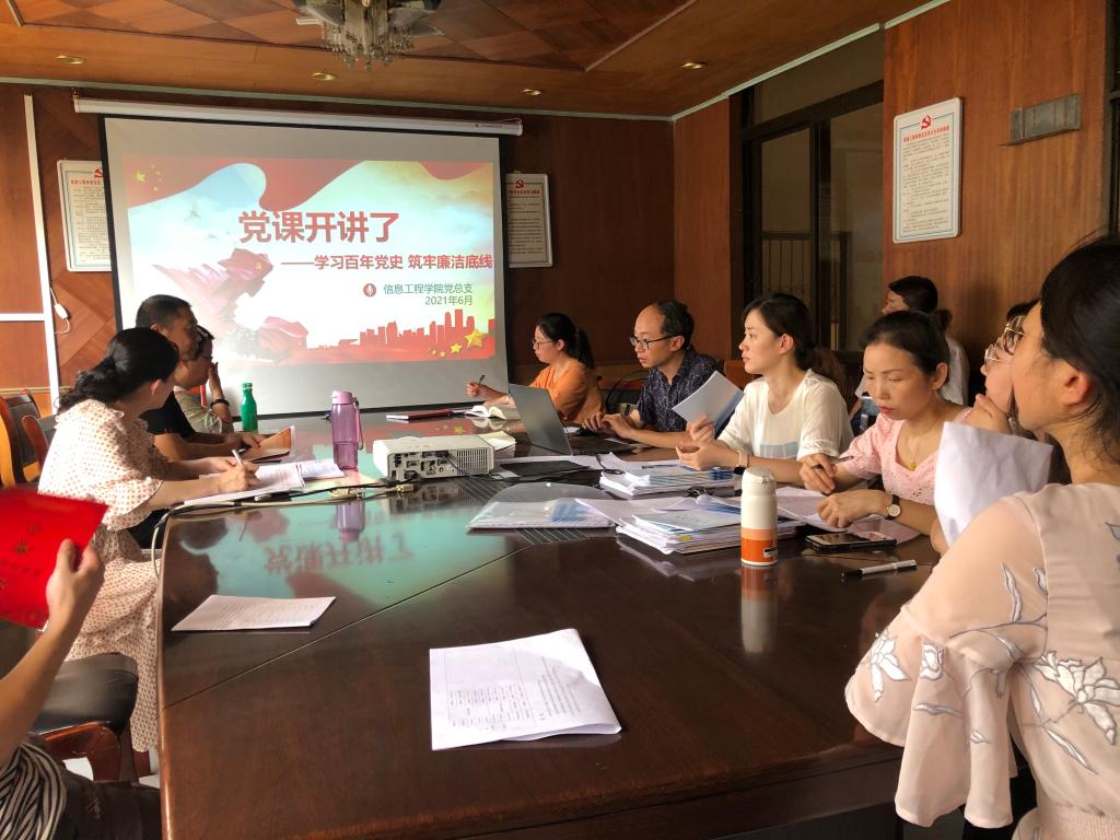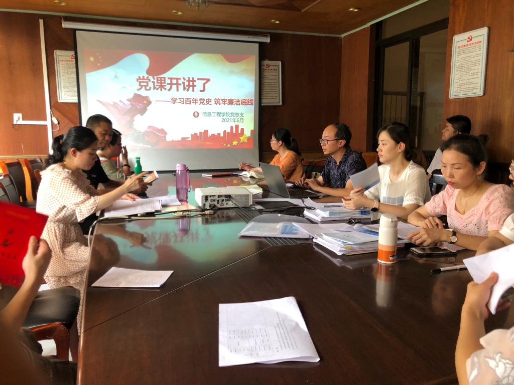 本站讯(信息工程学院 温倩)为进一步加强党史学习教育,提高党员同志的思想政治觉悟,夯实政治理论功底,6月18日下午,信息工程学院党总支在信息楼三楼党员活动室组织开展“党课开讲啦”活动。学院党总支副书记简靖韡以“学习百年党史,筑牢廉洁底线”为主题为全院党员教师上专题党课。