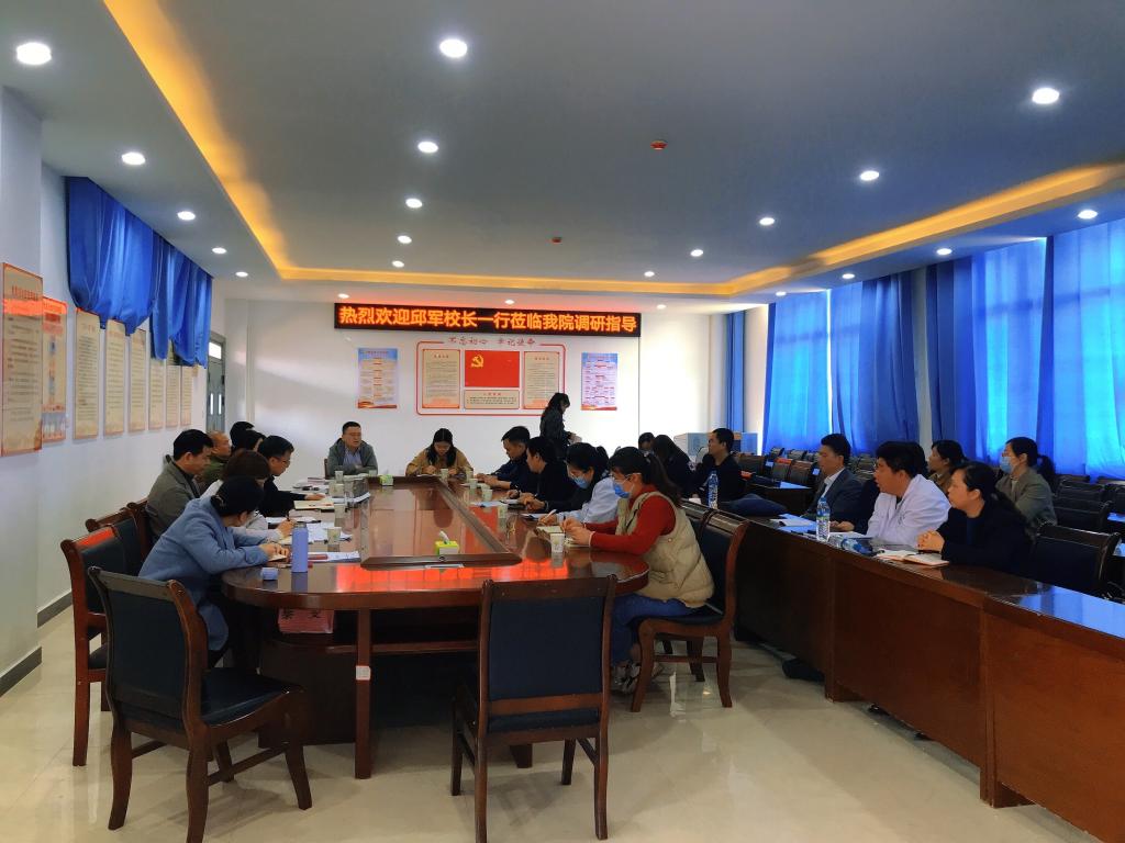 为进一步完善专业建设,提高人才培养质量,推进威尼斯官网“双高”建设项目,落实“三比三争”工作,3月31日上午,校党委副书记、校长邱军,副校长易滨秀携教务处、发展规划处、党政办、人事处等部门负责人一行来医学院(附属医院)对学院专业建设进行调研指导。学院全体班子成员、教研室主任及专业负责人等参加会议。