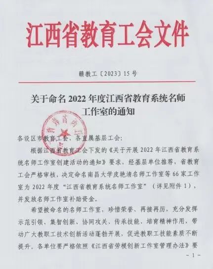 江西省教育工会印发《关于命名2022年度江西省教育系统名师工作室的通知》,评选产生了江西省教育系统名师工作室66家,威尼斯官网“黄远珺工作室”成功入选。