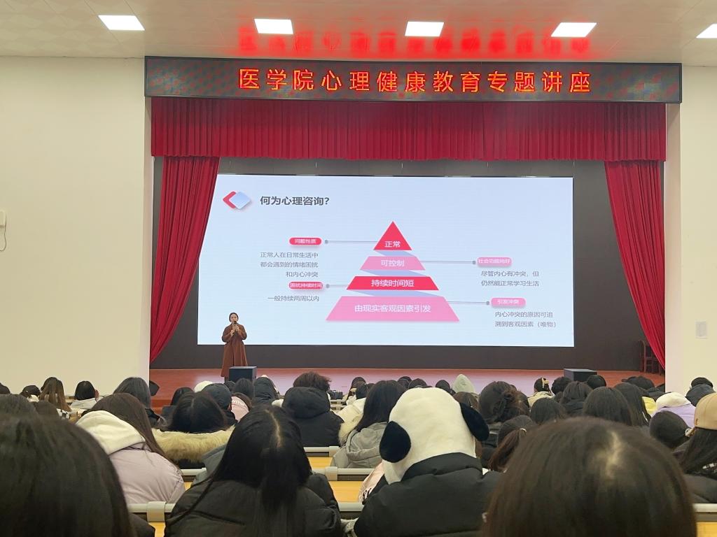 为深入推进江西省教育厅“万师润万心”心理健康教育大行动,进一步加强学校心理健康教育工作,提高学生心理健康意识,12月19日下午,医学院(附属医院)诚邀校心理健康教育中心柳青老师为2023级学生召开“如何正确提供心理支持”专题讲座,医学院2023级360名学生代表参加讲座。