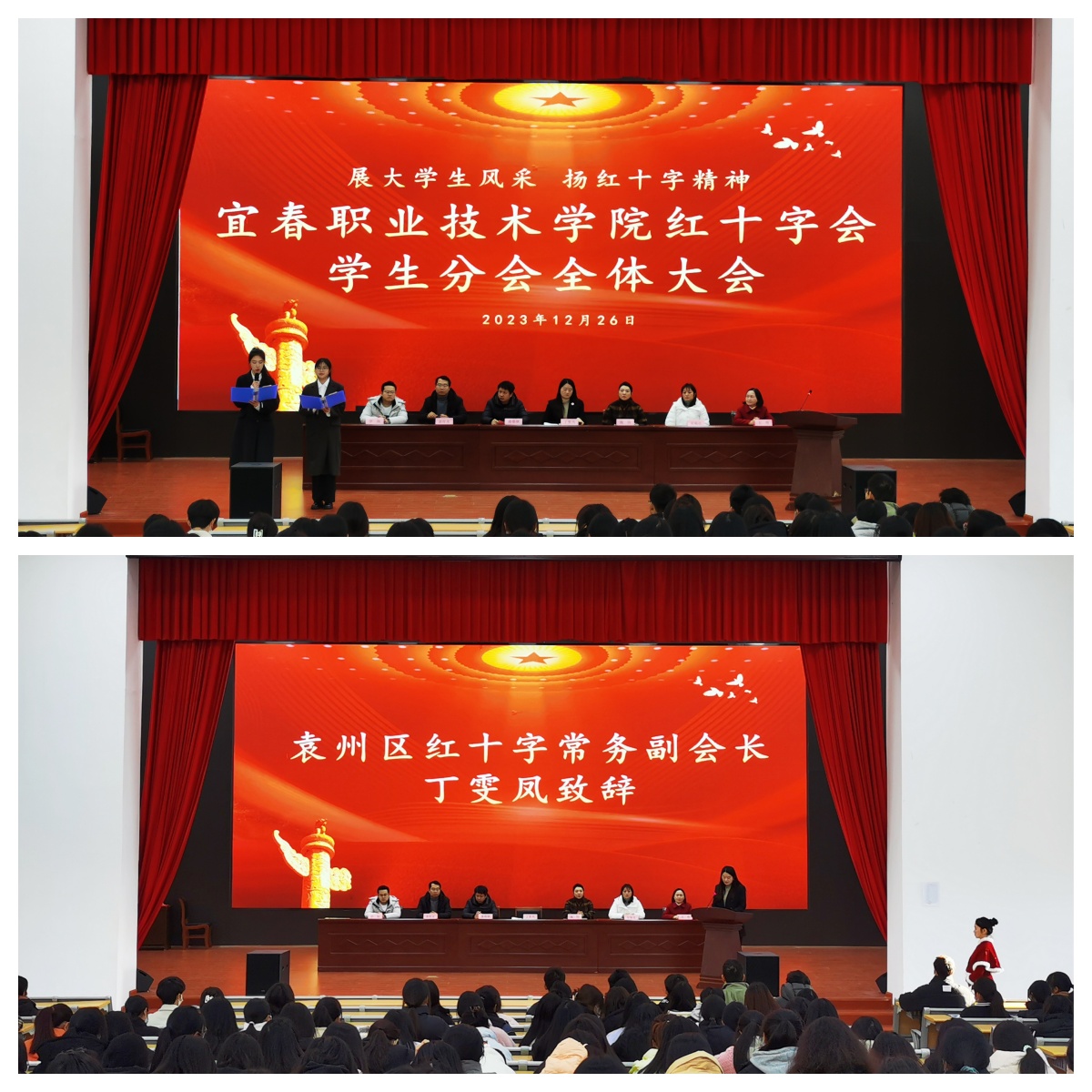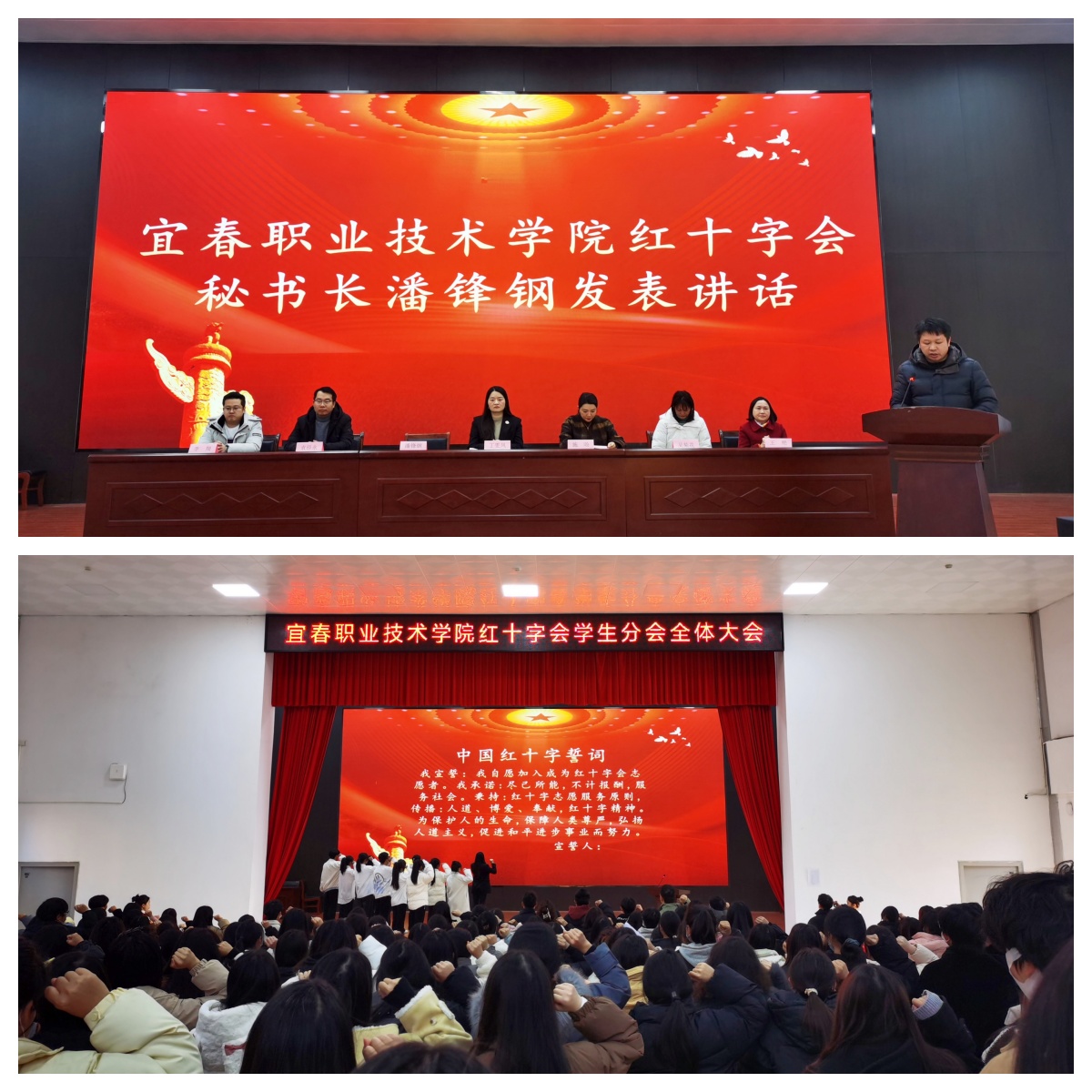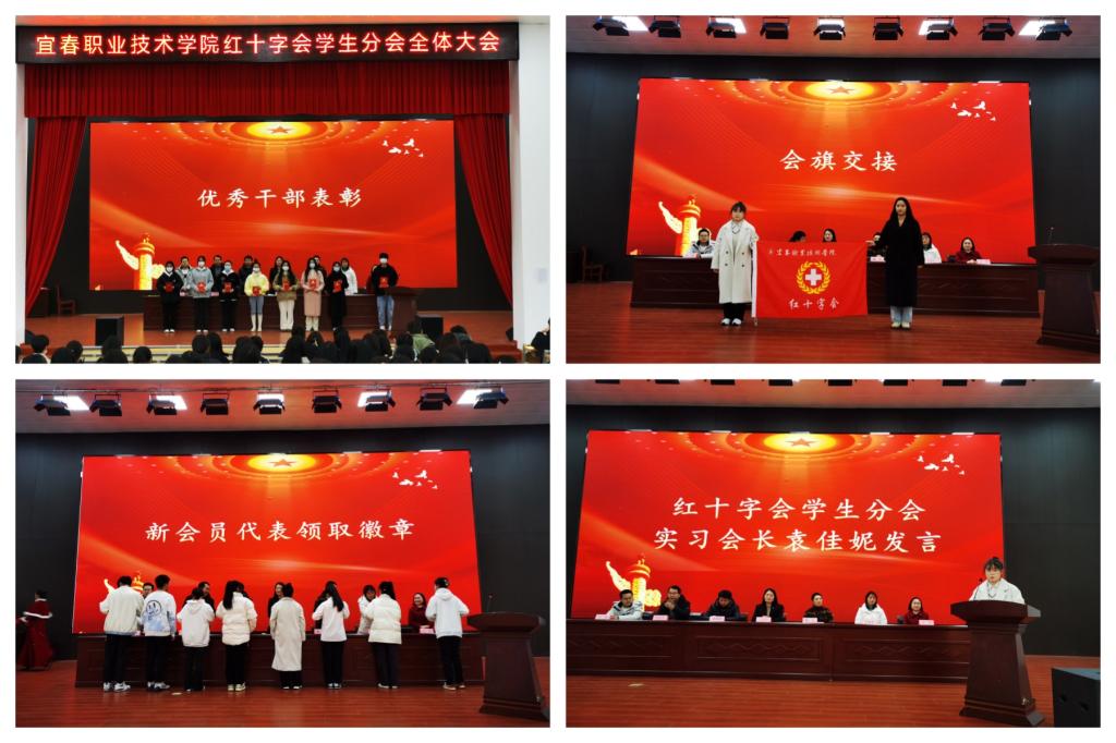 丁雯凤致辞,她表示党和国家高度重视发展红十字事业,希望协会成员围绕红十字会“三救三献”的主责主业,开展好应急救护培训、推广造血干细胞志愿入库、器官捐献志愿登记、关爱一老一小等志愿服务,为社会事业高质量发展贡献红十字人的力量。接着,施旸宣读红十字会2023年度优秀干部表彰决定,嘉宾们为受表彰同学一一颁发证书。随后,校红十字会学生分会会长徐祉祺发言,与实习会长袁佳妮进行会旗交接仪式。交接会旗后,袁佳妮发言。紧接着,参会嘉宾为新会员代表颁发徽章。会议第七项,红十字会秘书长潘锋钢讲话,他回顾了协会2023年开展的主要活动和工作,对红会接下来的工作提出了三点要求,同时勉励协会新一届成员此次大会为起点,以更加昂扬的精神、更加饱满的热情,用实际行动建设好宜职红十字会队伍,为学校红十字工作贡献青春力量。会议第八项,丁雯凤带领全体成员重温中国红十字会誓词,誓言铿锵有力,在礼堂中回荡。最后,市红十字会高级讲师王艳以“红十字会运动基本知识”为参会学生授课,详细介绍红十字会的发展历程和工作内容。