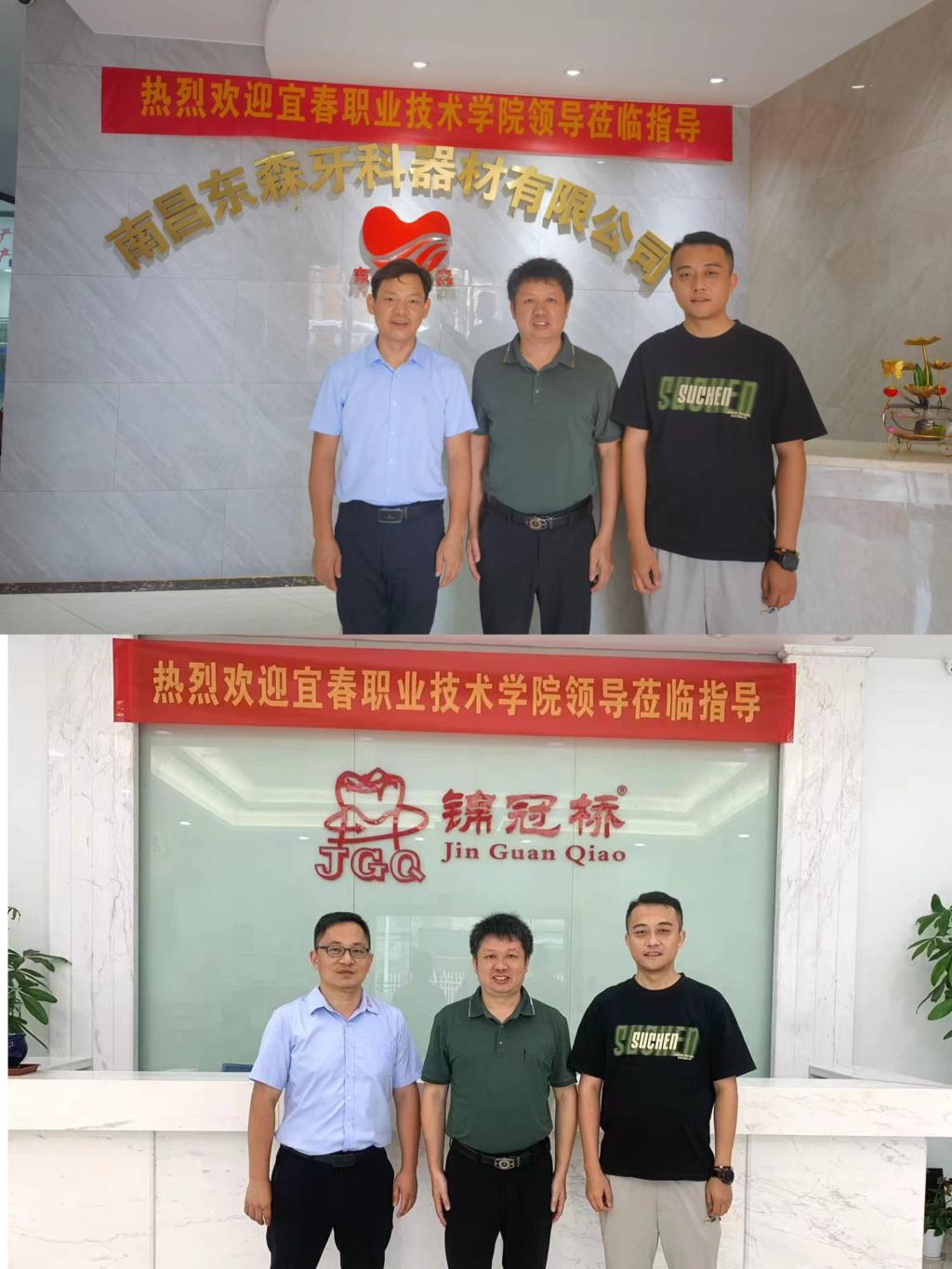潘锋钢首先到访了南昌东森牙科器械有限公司,在公司董事长郑年伟的带领下,参观了企业的生产车间和仪器设备,了解了企业的发展历程和经营情况。随后,潘锋钢与企业负责人进行座谈,就人才培养、专业实习、毕业生就业等方面展开交流。接着,潘锋钢前往南昌锦冠桥义齿有限公司进行调研,与公司总经理陈文俊等企业管理人员就深化校企合作、促进优势互补、实现共同发展进行了探讨。